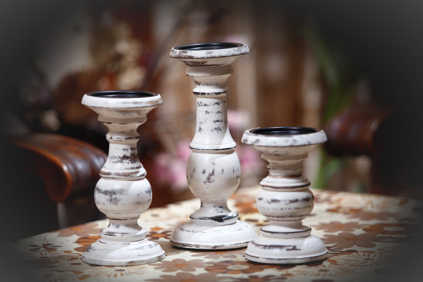 Turned Design Wooden Candle Holder With Distressed Details, Set Of 3