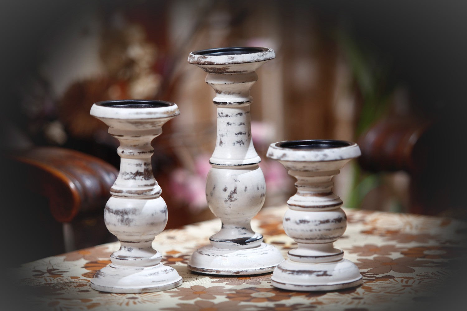 Make an eye-catching decor collection for your interior with the inclusion of this pillar shaped candle holders. This set of 3 candle holders comes in a distressed white finish and features detailed hand-carved details in mango wood. Pair them together or separately as they will have the same impact in enhancing the beauty of your decor.