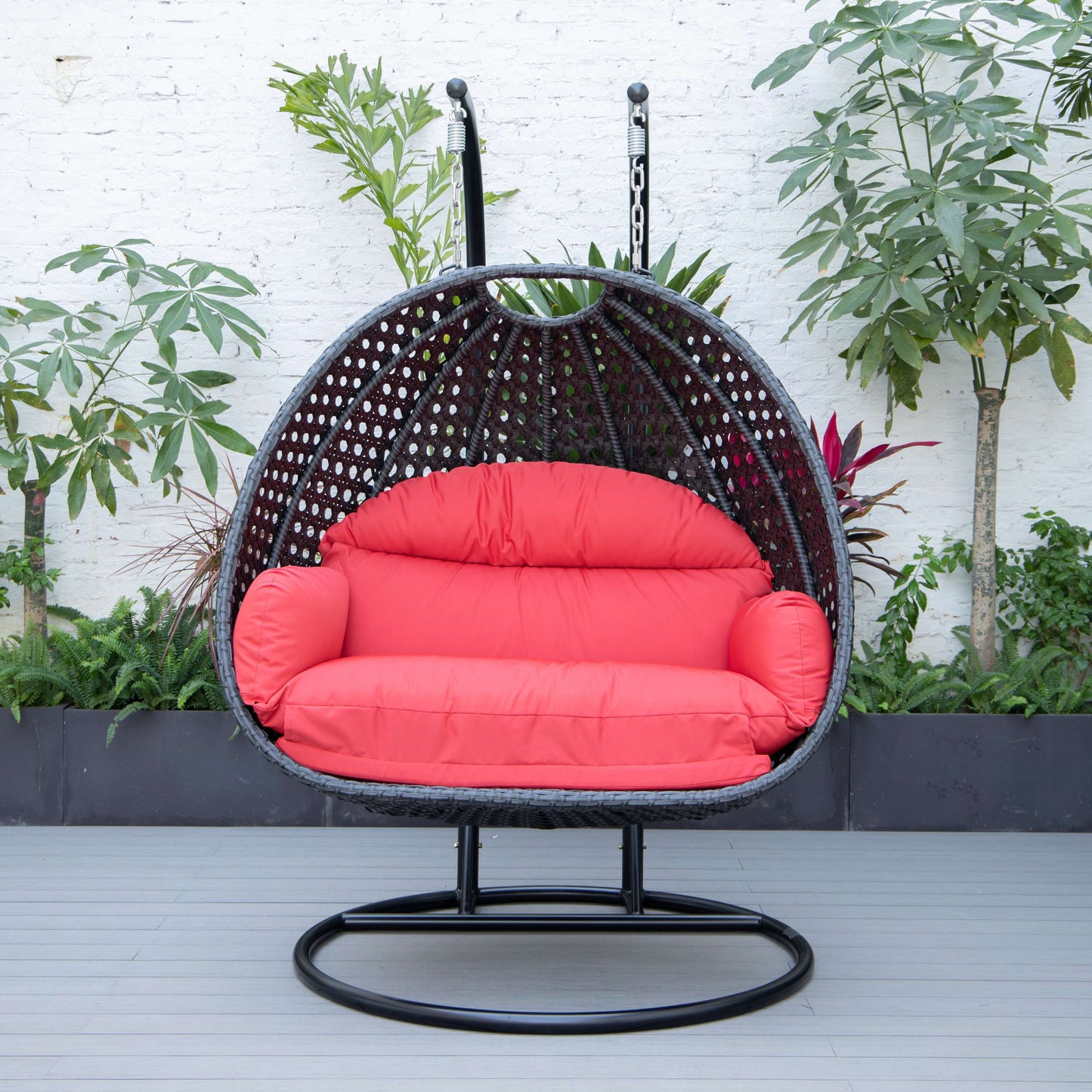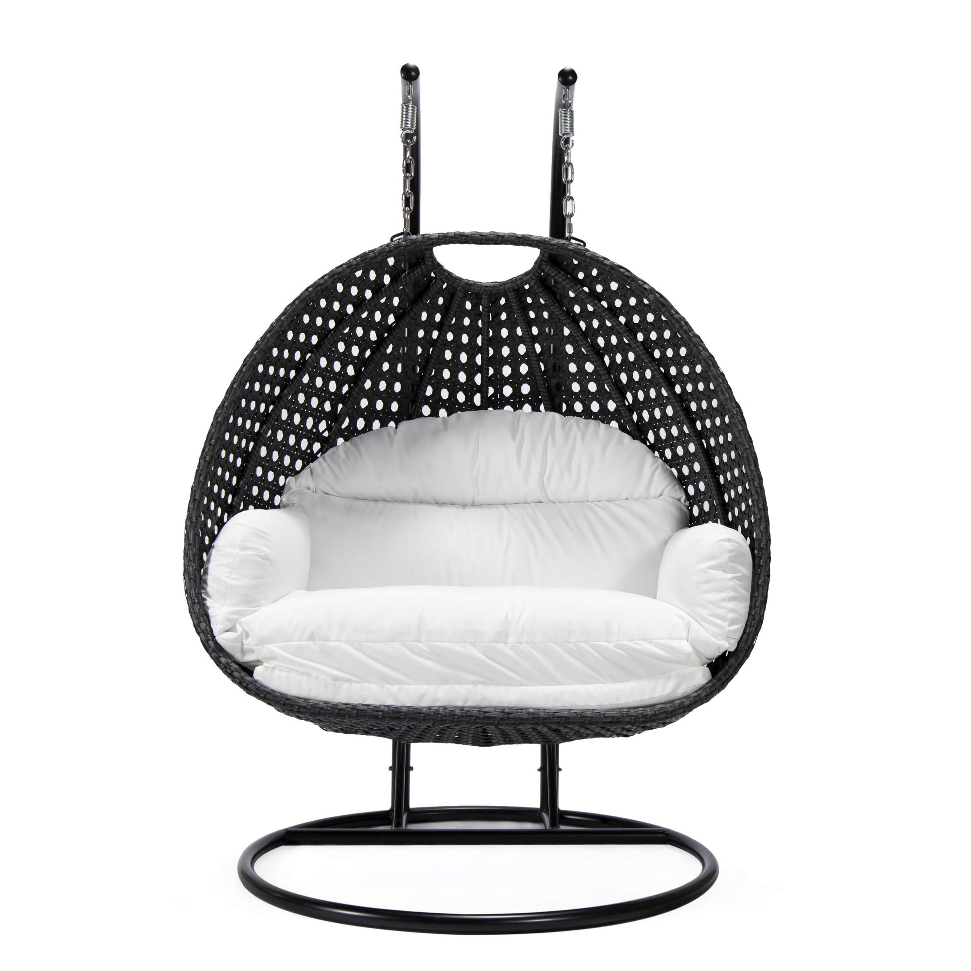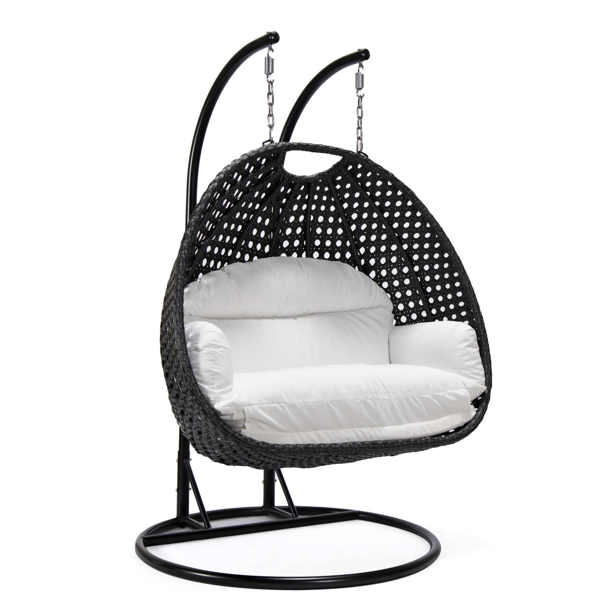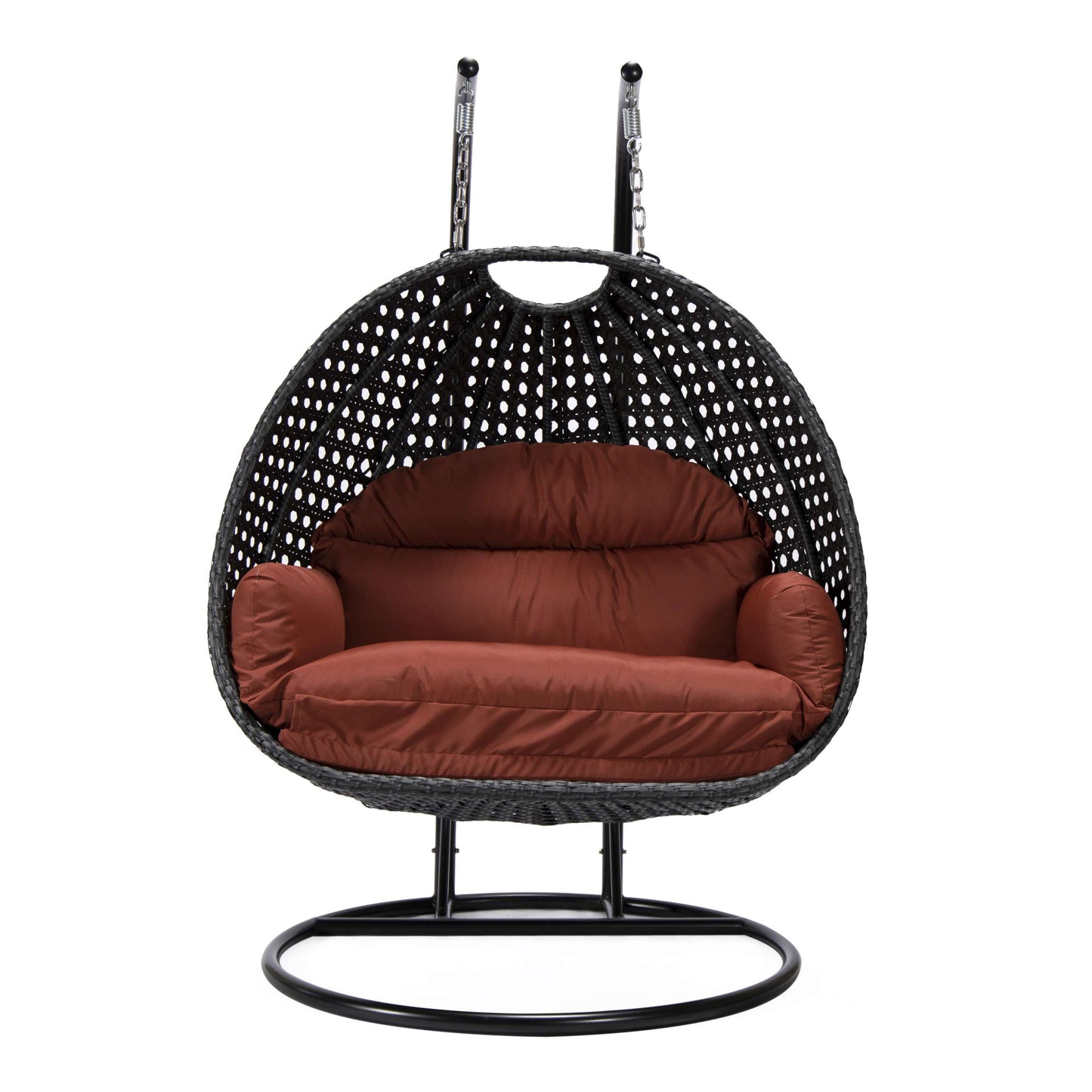 This fun egg-shaped porch swing chair which fits 2 people comfortably was built to last in the outdoors with its strong & durable Iron frame it will be perfect for all weathers. Sit in luxurious comfort while surrounded by the peace and beauty of your backyard, or enjoy a good book indoors with this comfortable hanging chair. This stylish hanging chair adds an eye-catching design and a comfortable place to stop and enjoy all your beautiful garden