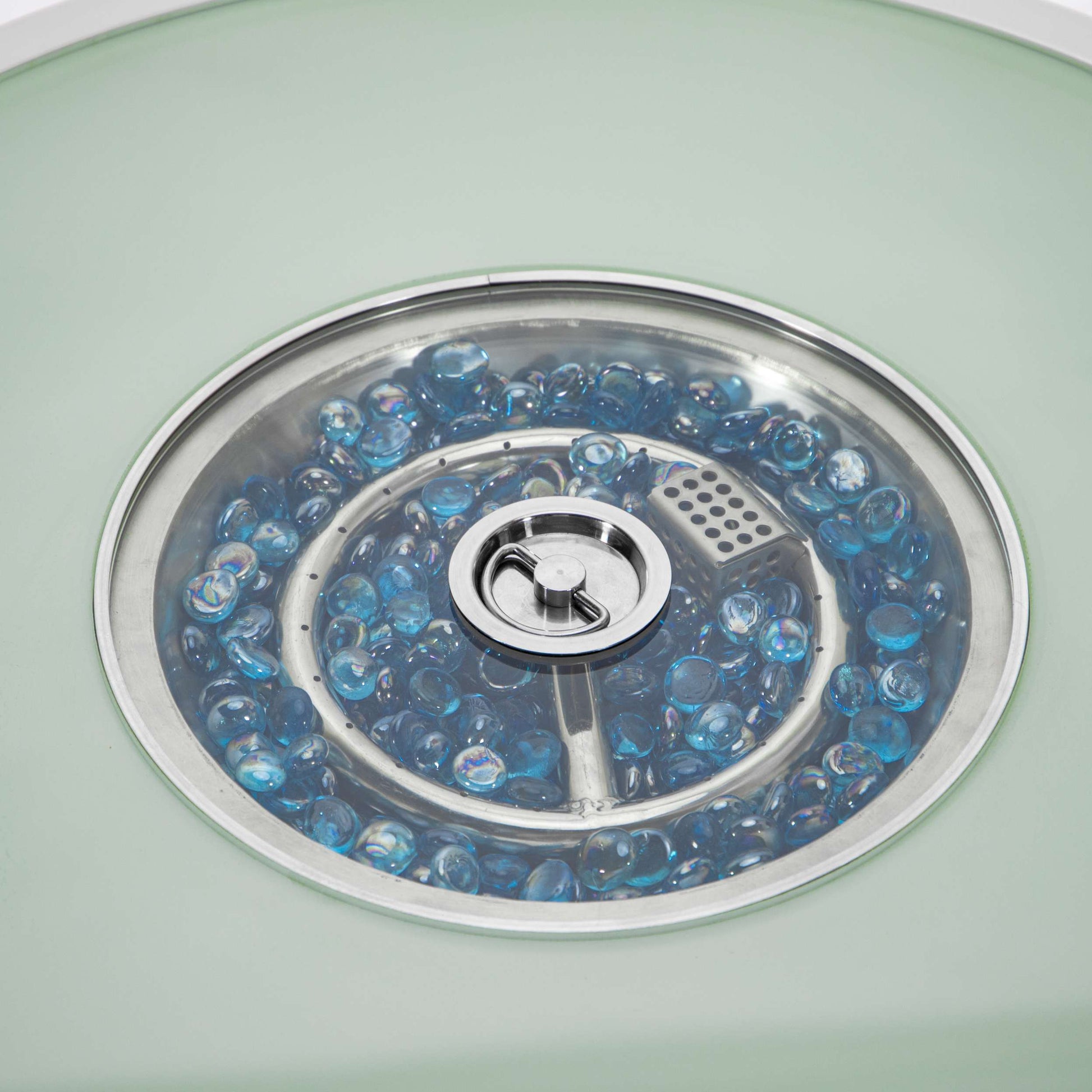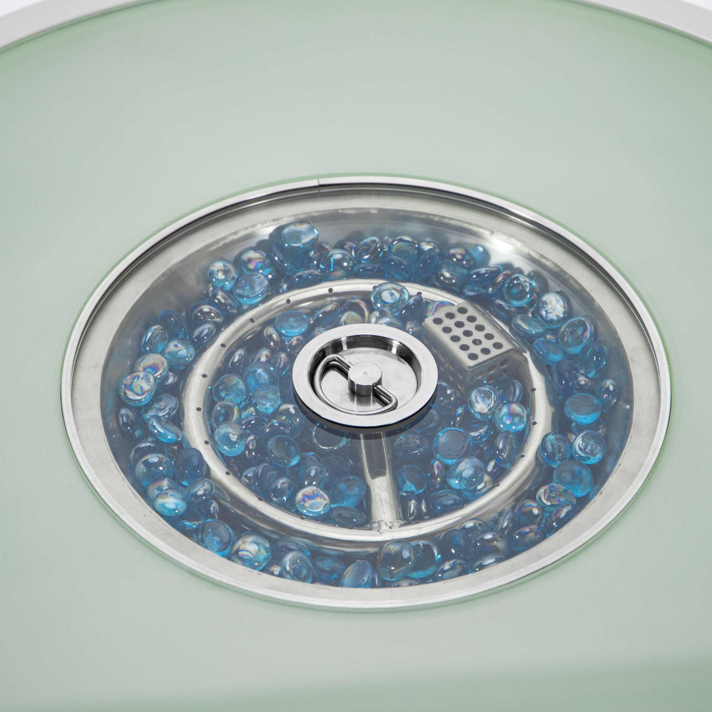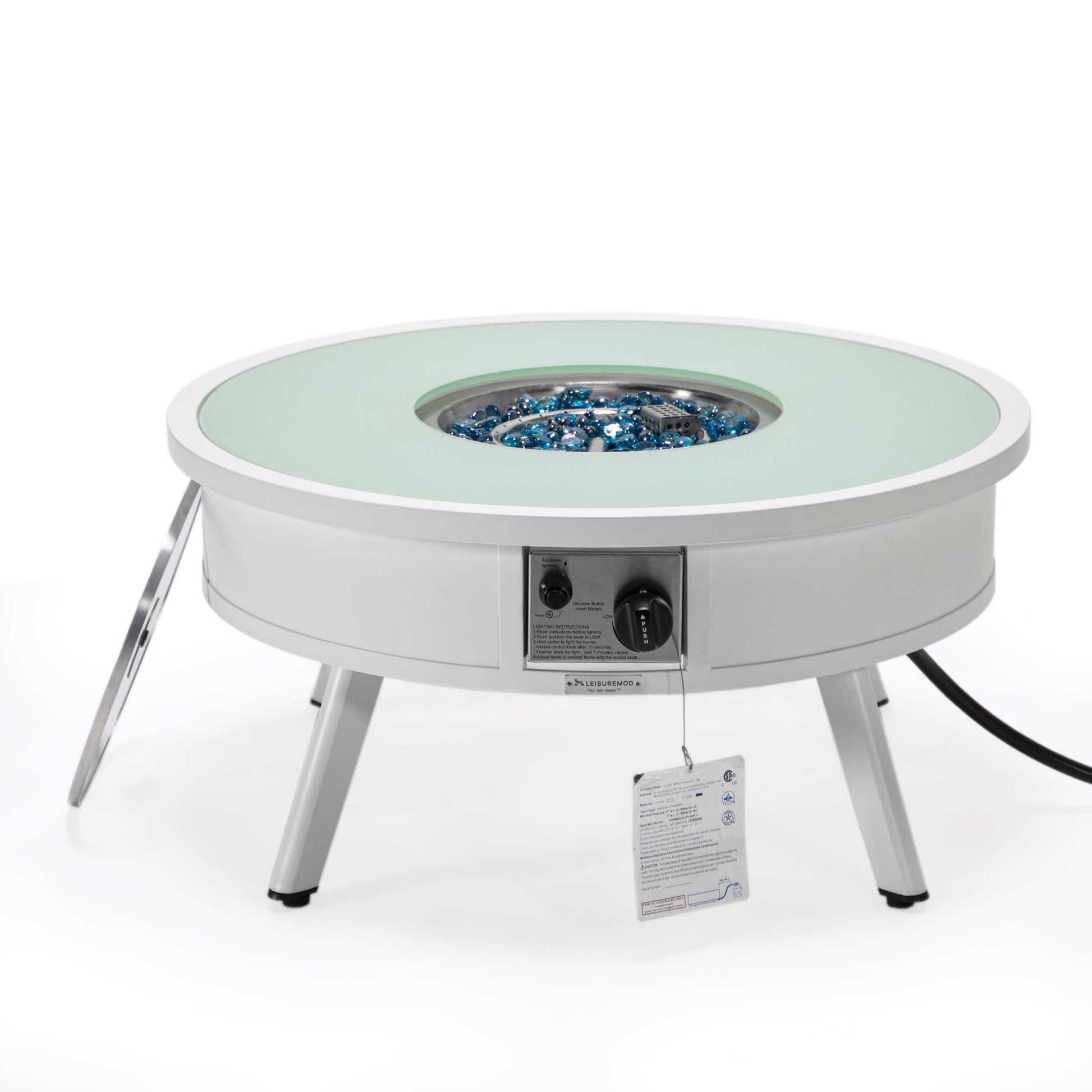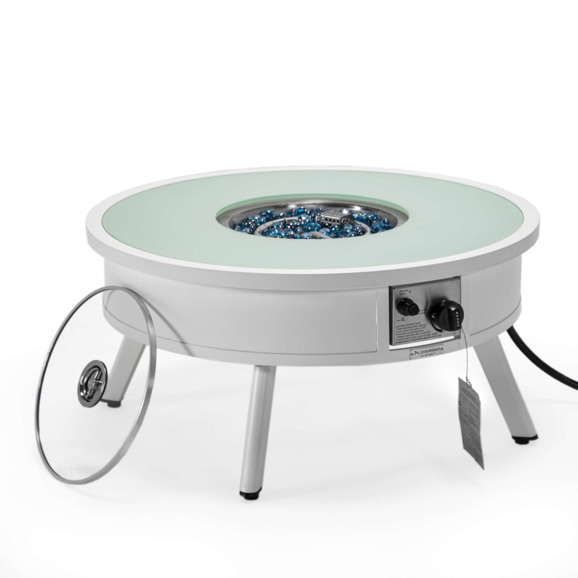| The modern Round fire pit table comes with a lid, allowing you to convert it into a functional table when not in use. The crystal stones included will add touch of elegance and sophistication to the flames. |
