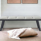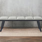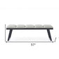 Practicality and fashion mix together with this handy 57-inch light gray and black upholstered faux leather bench. The light gray upholstery top of this bench is a nice contrast to the high quality, black metal of the base. Expertly upholstered with padding in a soft solid color faux leather, this bench is as comfortable as it is good looking. Ideal for entrance foyer, hallway, or laundry room. This bench is a great place store your keys, put on your shoes, or be a catchall on your way in or out. Easy to blend into most any room, a bench is a way to add a good looking accent to your space that can also be practical and useful. . 18-inch H x 57-inch W x 16-inch D