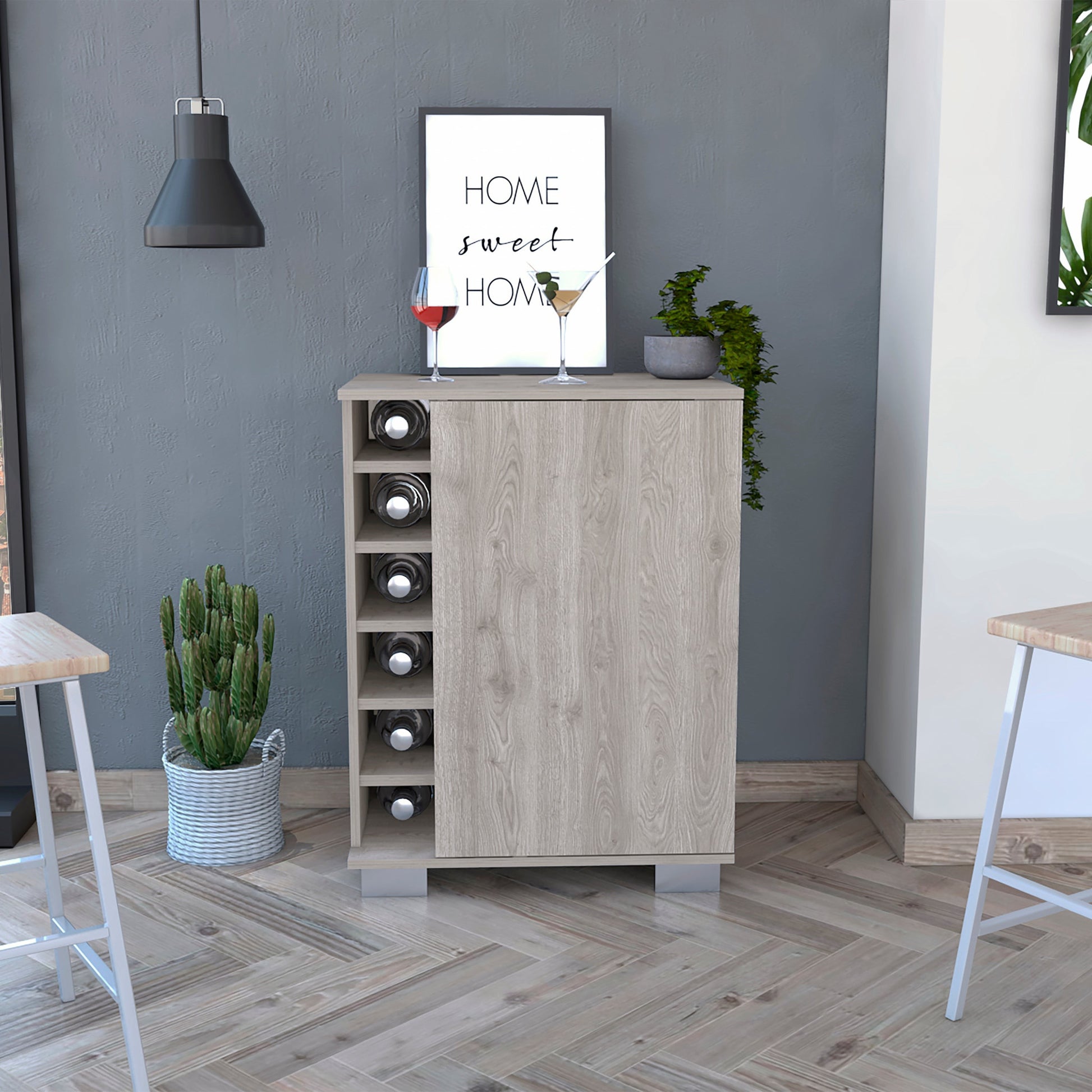 Create your own bar paradise and party-ready corner for your contemporary living space with this Light Gray Bar Cabinet with One Door Panel. The bar cabinet’s design itself creates the ultimate feeling of comfort and pleasure, together with the light gray which visually brings a balanced feeling to your space. One large door panel comes with two inner spacious shelves with eight liquor or wine bottle cubbies on the left side of this cabinet, and with a wide top surface making this a complete storage center with quick access for relaxing or welcoming your special guests with a luxury and happy vibes. Crafted from durable particleboard which is perfectly designed to resist moisture and humidity. Four sturdy open and airy geometric designed black metal legs add to a contemporary design feel. Have the pleasure of entertaining to a whole new level with this functional yet fashionable piece. 32.10” X 24.40” X 18.10”