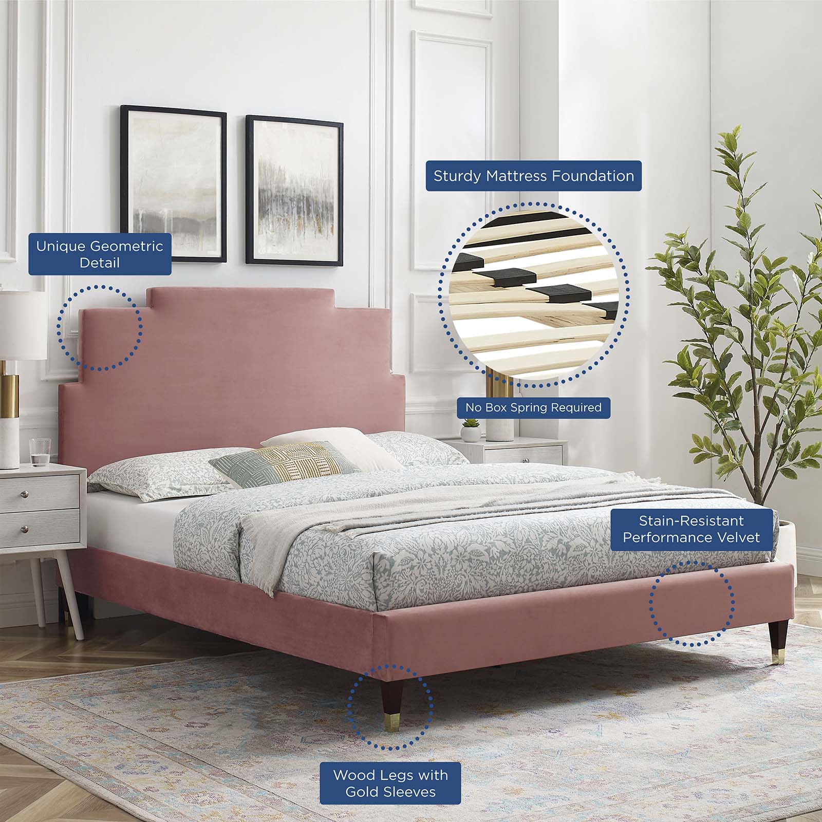 Elevate the style in your master bedroom or guest bedroom with the Lindsey Performance Velvet King Platform Bed. The padded headboard of this king size bed features luxe texture, clean lines, and escalating silhouette. Rich in glam deco style and vintage modern elegance, this upholstered bed is covered in stain-resistant performance velvet and is a sturdy mattress foundation for memory foam, innerspring, latex, and hybrid mattresses. Eliminating the need for a box spring, the MDF frame of this king platform bed is complete with a wood slat support system crafted with poplar for lasting durability and support. This slatted bed frame rests on wood legs with gold metal sleeves and non-marking foot caps and includes a reinforced center beam with two support legs for enhanced stability. Assembly required. King Bed Weight Capacity: 800 lbs. Set Includes: One - Harlow King Platform Bed Frame One - Kasia King/California King Headboard