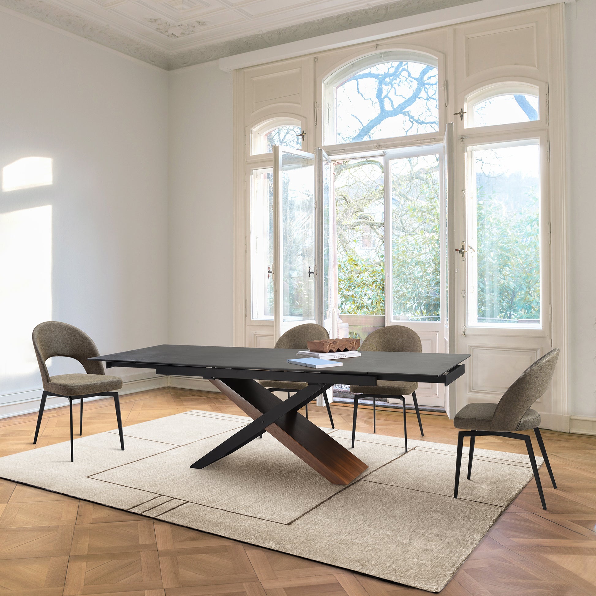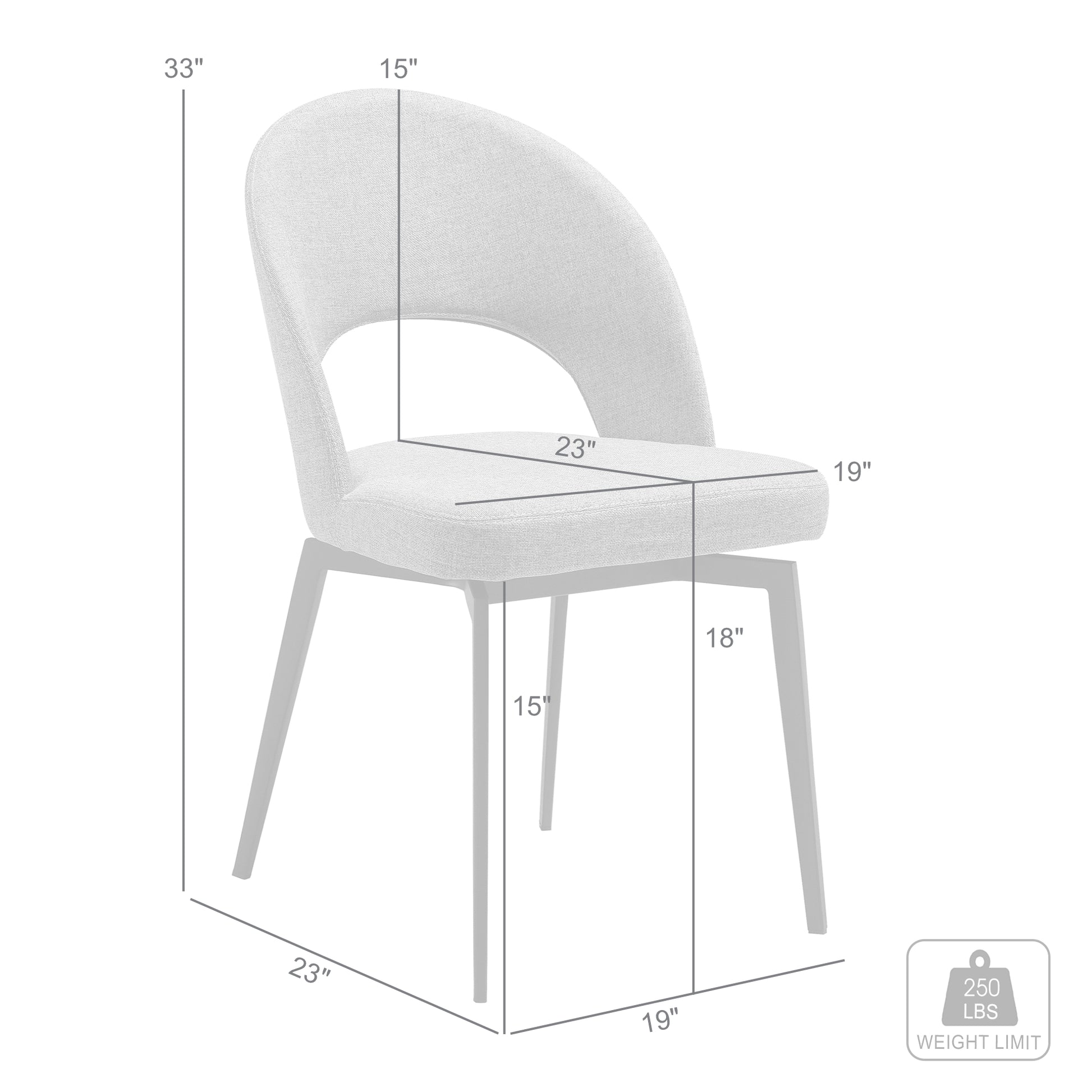Elevate your home with the modern charm and elegance of our Lucia Upholstered Swivel Dining Chairs - Set of 2 in Fabric with Black Metal Legs. Beautifully minimalistic, our dining chair stands out with a refined and striking silhouette. A sleek cut-out and slender black metallic legs complete the modern and sophisticated appeal of the kitchen chair. It's ergonomically sculpted back delivers exceptional comfort, supporting you in just the right places. The back and seat are both generously padded to bring a dose of comfort to your formal and casual meals. Our dining room chair can also serve as a comfy seat in your home office or provide a comfortable spot to relax in your living room. The dining table chair also includes a 180 – degree swivel function allowing you to change directions and follow conversations with ultimate ease. It is upholstered in performance fabric for easy care and maintenance. Our Lucia dining chair is available in your choice of Gray or Brown Fabric Upholstery with Black Metal Legs to perfectly befit your modern or contemporary home or apartment. These dining chairs are sold as a set of 2.