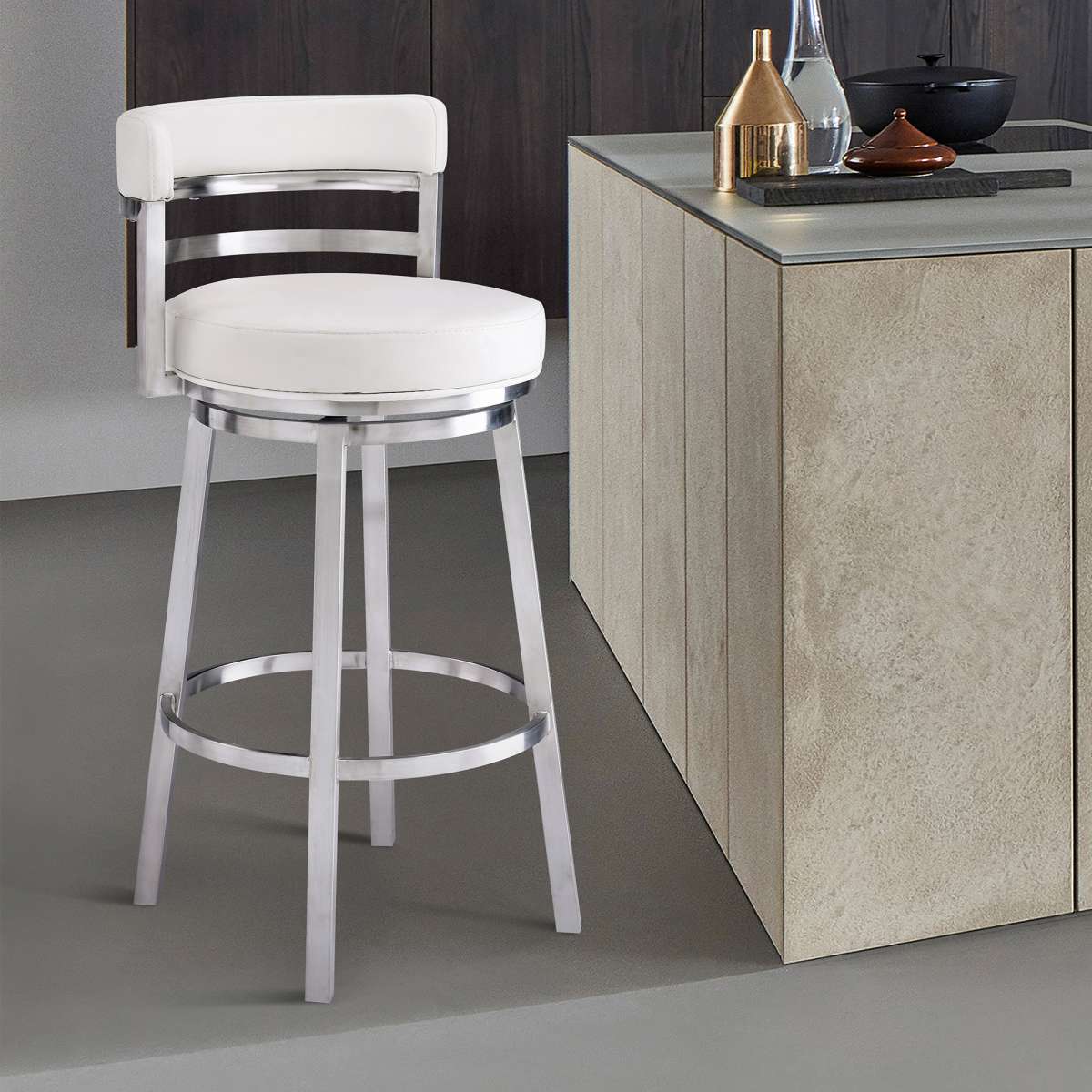 Style and function come together in harmony with the Madrid 30" Bar Height Swivel White Faux Leather and Brushed Stainless Steel Bar Stool from Armen Living. Its armless design makes this the perfect addition to any home or apartment as it allows you to pull the kitchen stool as close as needed to your kitchen island, peninsula counter, or home bar. The Madrid frees you of any visual constriction with the 360-degree swivel motion, helping to keep you engaged with your friends at family at gatherings. The upholstered low back is rounded, providing the user with exceptional ergonomic support. The Madrid’s padded bar seat and back are constructed from high-density foam and wrapped in soft faux leather upholstery that will keep you comfortably seated for hours on end. The strong metal frame that’s further accented by the inclusion of a round footrest. The Madrid's legs are tipped with floor protectors, assuring that the bar stool will not slip on or scratch hardwood or tile floors, ensuring a durable bar or counter stool that will last for many years to come. The Madrid bar or counter stool is available in 26” or 30” seat height and comes in a brushed stainless steel finish with black, grey, white, blue, green, or red faux leather upholstery; a mineral finish with bandero tobacco or ford black faux leather upholstery, an auburn bay finish with brown faux leather upholstery, or a black finish with ford black faux leather upholstery.