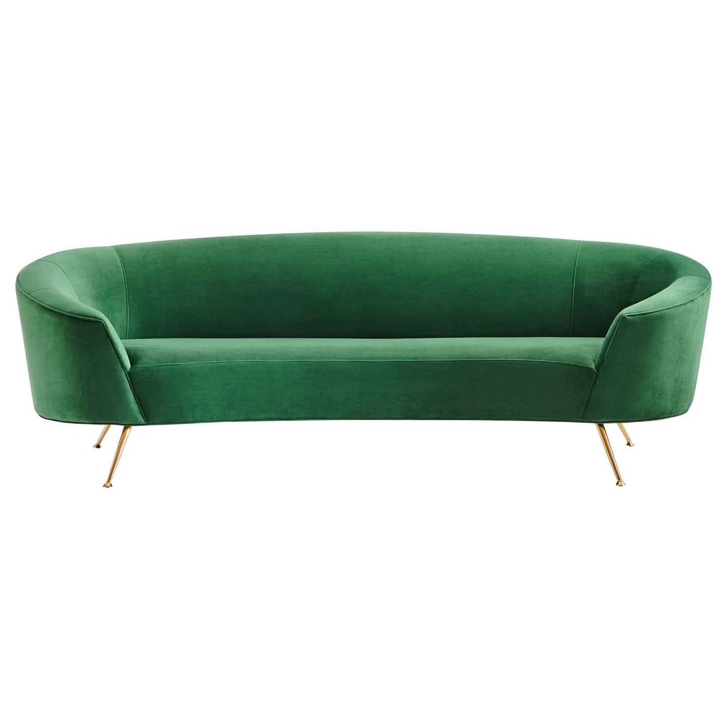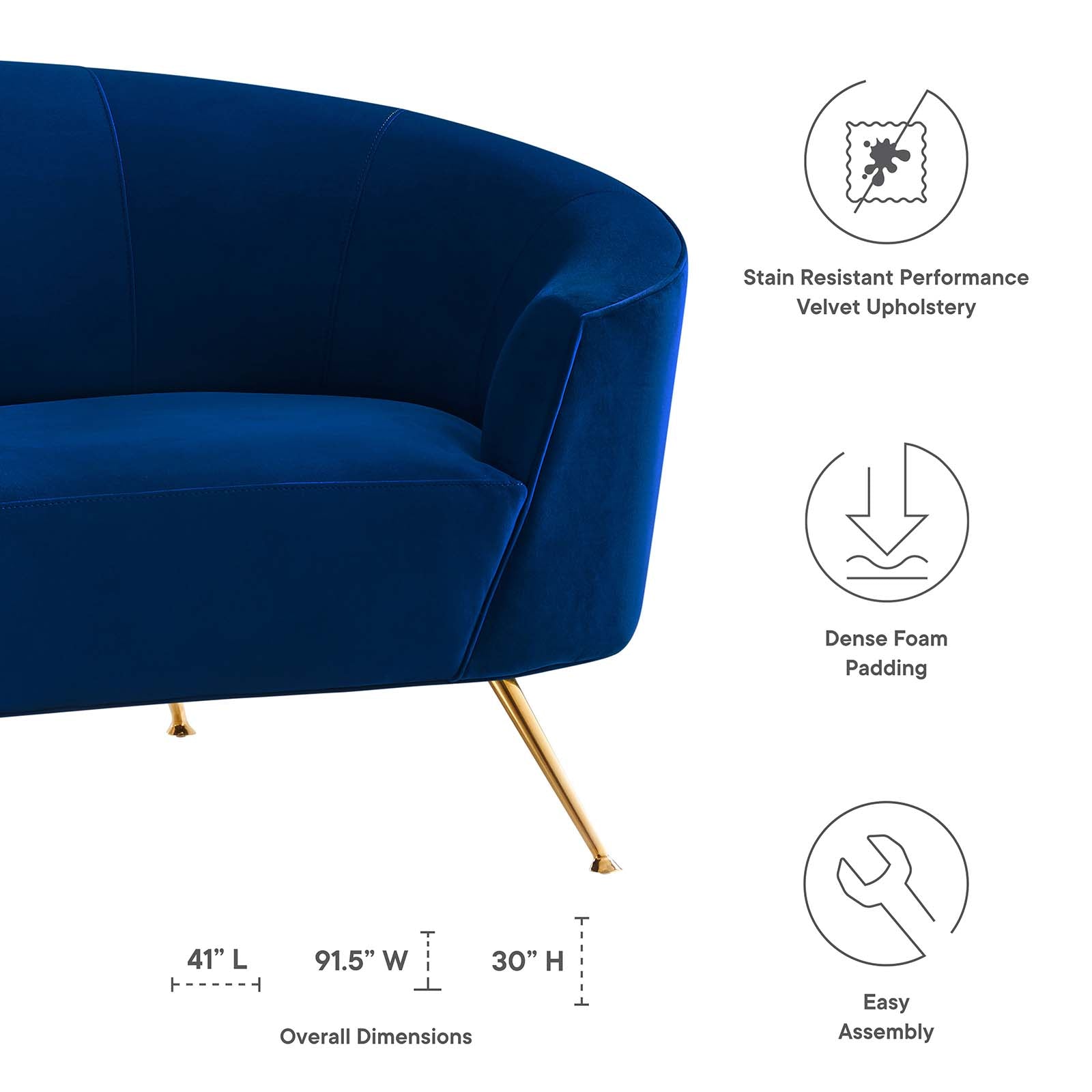 Elevate your living room style with the sophisticated aesthetic of the Marchesa Performance Velvet Sofa. Solidly constructed with a durable webbed support system, this retro-modern sofa enlivens your living room or lounge area. Carried with panache on splayed gold stainless steel legs, this expansively curved sofa is the picture of elegance "mid-century modern, contemporary or eclectic settings. The Marchesa Performance Velvet Sofa is sure to become a compelling family room favorite with dense foam padding and stain-resistant performance velvet upholstery. This sturdy couch is a gracious addition to the bedroom or home office. Marchesa is outfitted with non-marking foot glides to protect your floors. Sofa Weight Capacity: 993 lbs.