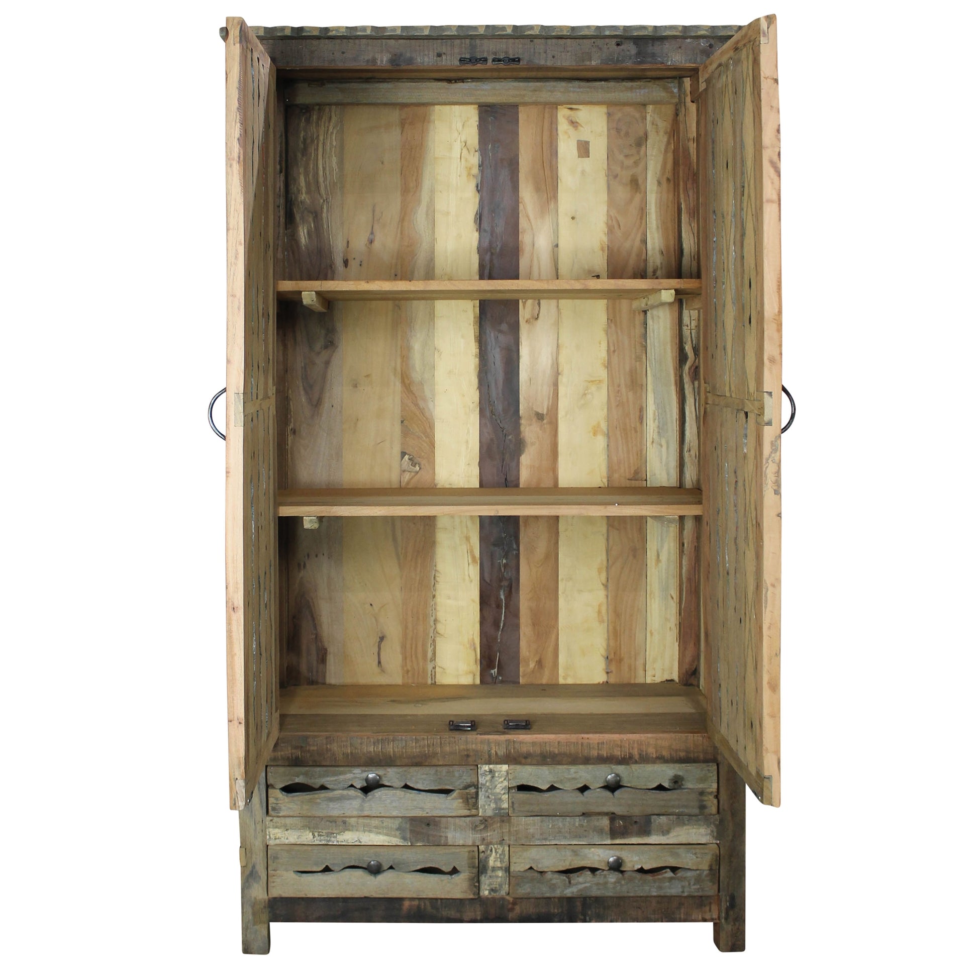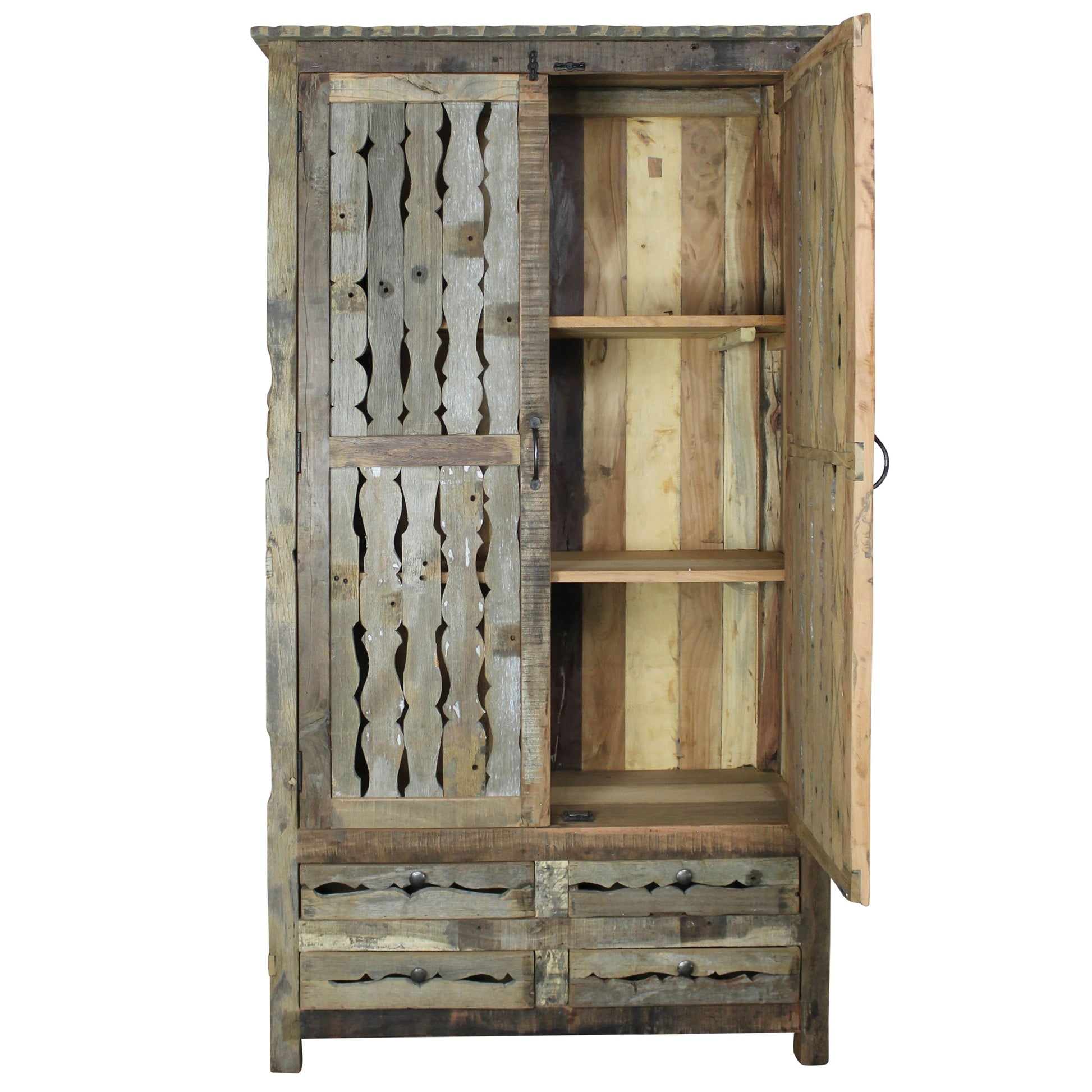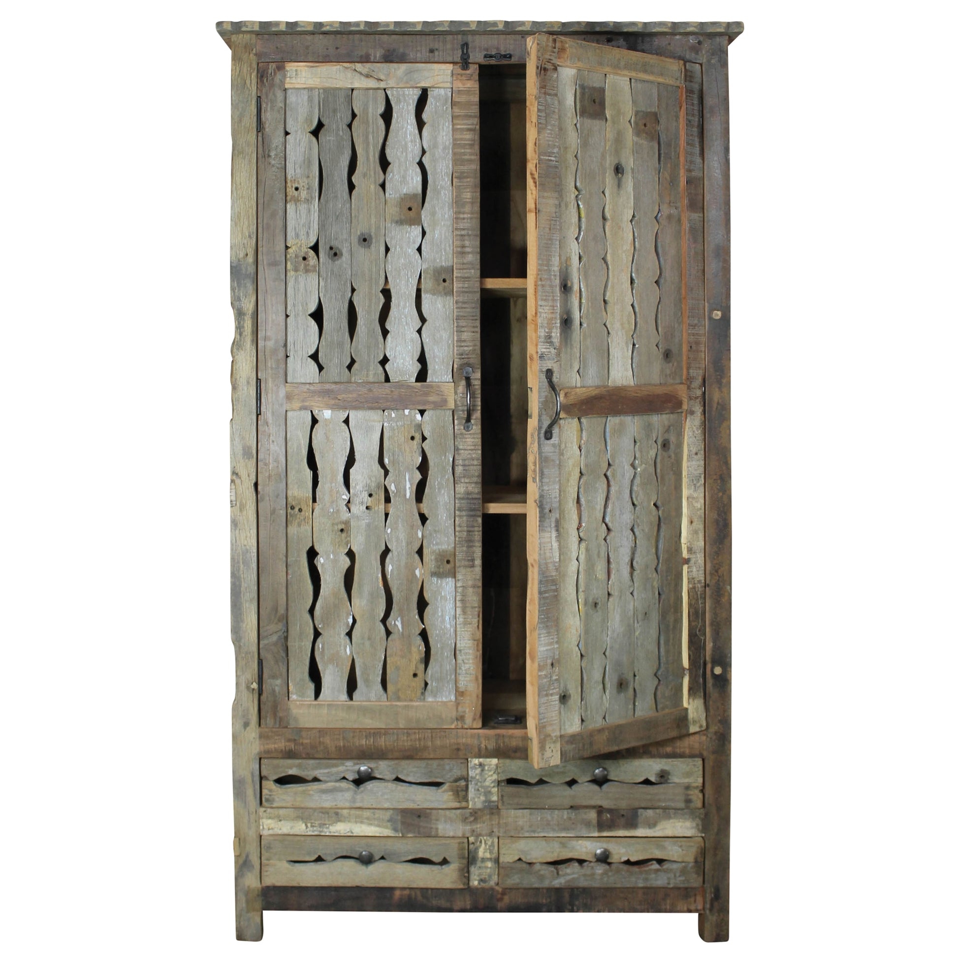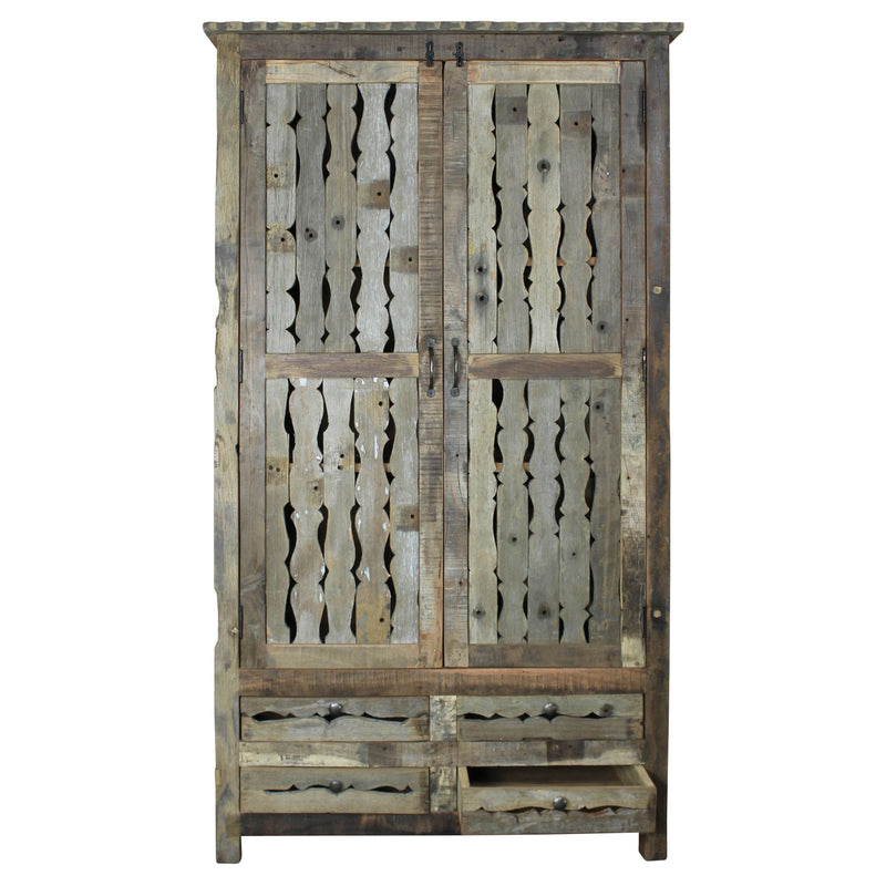 Crafted of salvaged, decorative wood slats this cabinet features 2 interior shelves, 4 drawers and endless opportunities for storage. As a rustic armoire or unique media console the homespun charm of this cabinet is here to make a statement.
