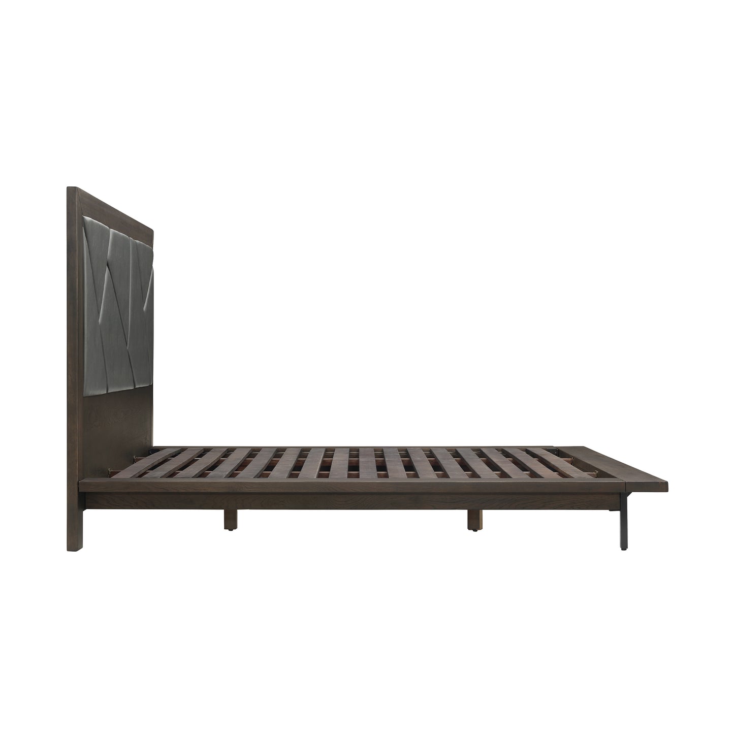 Make an elegant style statement with our Marquis platform bed frame in oak wood and faux leather with black metal legs. Its elegant, smoke oak wood frame is upgraded with faux leather accents. Creating striking and asymmetric patterns, our bed makes a powerful design statement. It combines the coziness of grey faux leather with the warmth of Oak wood for an inviting and stylish look. Unlike other hardwood materials, oak furniture requires minimal maintenance. Because it is a dense wood, it does not scratch or stain easily. Thus, you can keep it looking brand-new, like when you first purchased it. All you need to do is dust it and apply furniture wax at least every six to nine months. The bed frame extends from the mattress and rests upon black metallic cylindrical legs. Platform beds can be used with most types of mattresses, including innerspring, memory foam, hybrid, and latex. Enriched with modern glam, our platform bed frame perfect for lounging and reading through the day and enjoying a restful sleep at night. King bed frame dimensions 89" L x 84" W x 52" H. Queen bed frame dimensions 89" L x 68" W x 52" H.