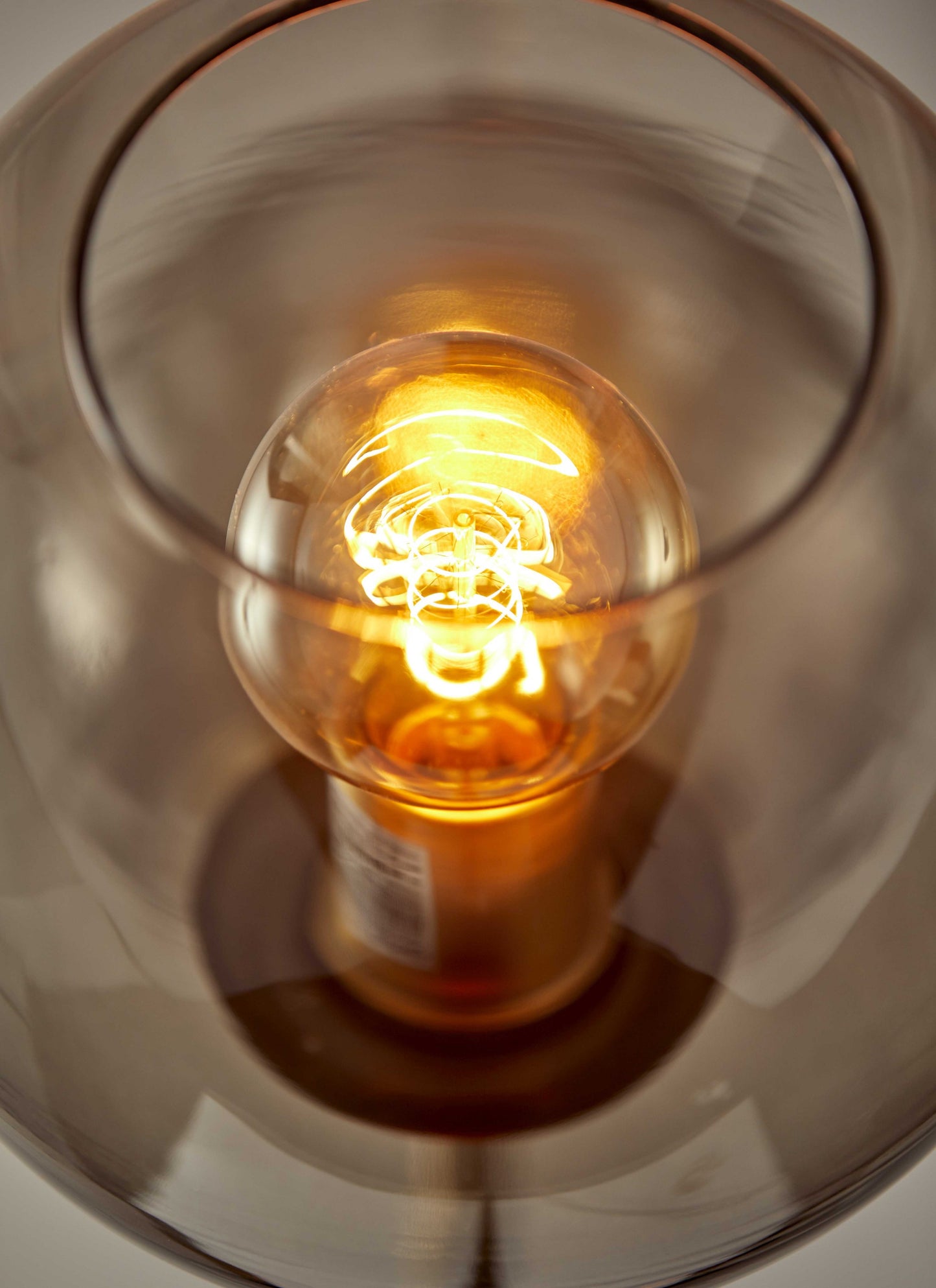 Set the mood with this two-light floor lamp. Included with this purchase, are two vintage-style Edison bulbs with a unique globe shape that mirrors the shape of beautiful smoked glass shades. A matte black metal finish and a black fabric covered cord add a contemporary edge. The double shade construction transforms this strikingly decorative piece into a functional floor lamp lighting up a large area. Turn the lamp on and off with a simple rotary switch.