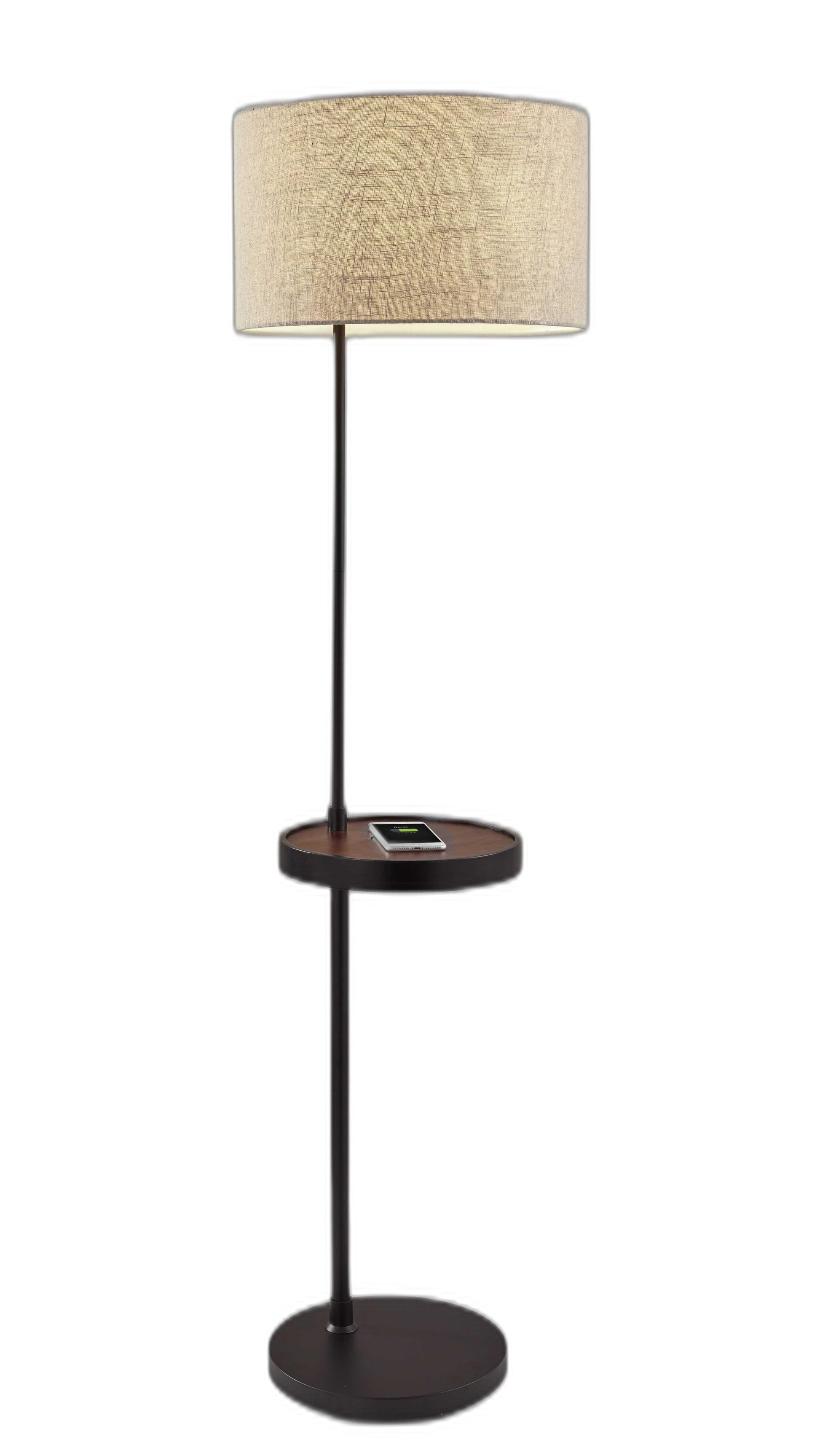 An essential addition to your living room, this Table Lamp includes a wireless charging pad with Qi inductive charging technology. A matte black finish is mixed with walnut wood for mid-century modern appeal. A natural fabric shade reveals its beautiful texture when lit. A 12.25" round shelf holds the wireless charging pad. Place this lamp next to your sofa for easily accessible storage and charging needs. Many smartphones (list below) have Qi technology built-in, so just place your phone on the pad and it will charge right up. All Charge product is Qi certified by the Wireless Power Consortium. The charge is unique in that you can use the Charge pad, the USB, and the light all at the same time with maximum efficiency of all three. An easily accessible rocker switch on the shelf turns the lamp on and off. Just plug in the lamp and the charger will work. This wireless charging pad will charge your phone through most materials, do you do not even need to remove your case! Only metal will hinder the function of the charging pad to charge through the case. If your smartphone doesnt support Qi wireless charging, you will need to purchase a Qi-compatible case, which is sold through a variety of retail channels. Or you can also charge your smartphone with the USB port that is also included in the lamp base. Compatible with Apple iPhone 8 / 8 plus / X / Galaxy Note 8 / S8 / S8 plus / S7 / S7 edge / S6 / S6 edge / S6 edge+ / Nexus 4 / 5 / 6 / 7 / LG G3/ Microsoft Lumia 1520, 1020, 930, 929, 928, 920