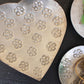 Silver heart-shaped plates with flower carvings make a sweet anniversary or birthday gift. Keep one for yourself and gift one to your bestie. The smaller is 6"WX 1"H, and the larger is: 7"WX 1"H, with three ball feet.