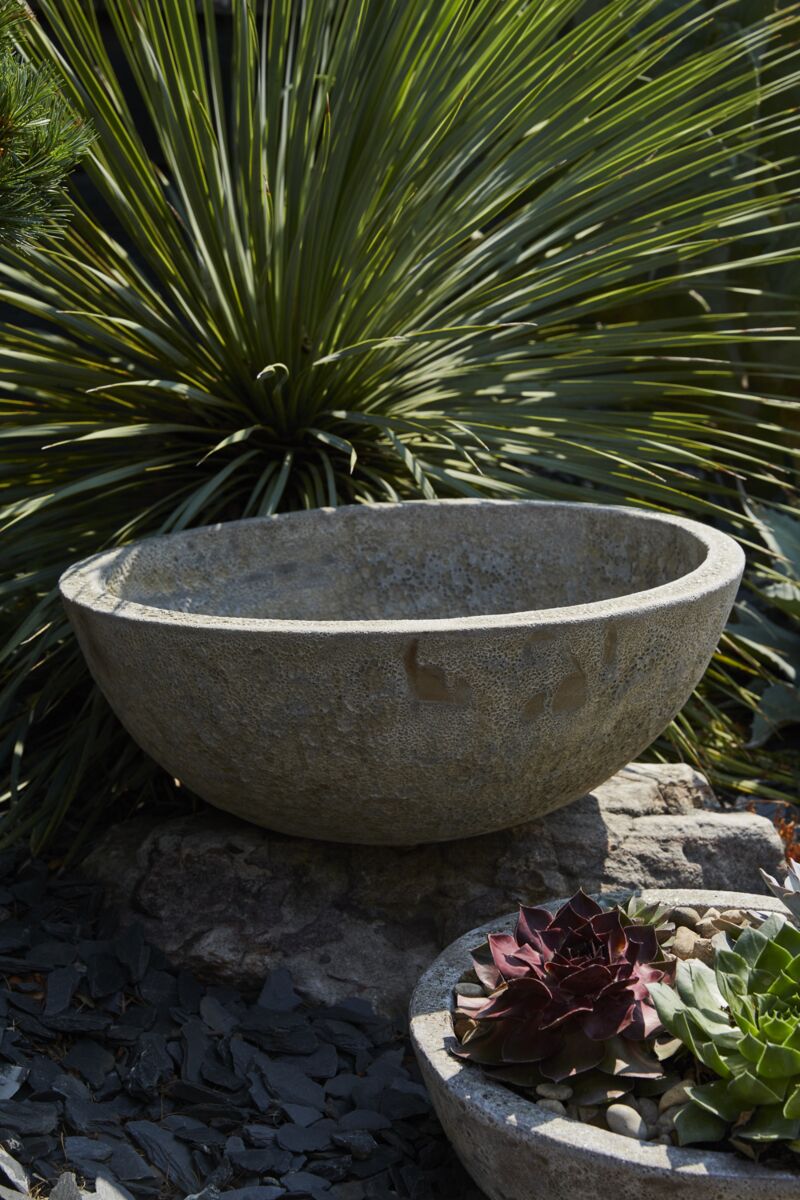 An organic, earthy surface gives the versatile, ceramic Meteora Bowl an aged, weathered look that only gets better with time when exposed to the elements outdoors. This low, wide, large planter is ideal for a succulent garden, trailing perennials, or an herb collection. Heavy & watertight, this textured, neutral piece is beautiful displayed indoors or out, on a large surface or the ground, or layered with other planters of varying heights.