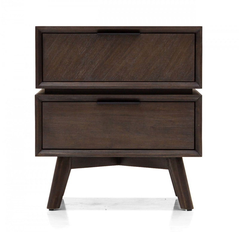 Radiating a striking personality, the Mid-Century Acacia Nightstand with Two Drawers and Black Metal Handles is fabricated to stand the test of time. The impeccable depth of the acacia veneer on the solid wood sets forth a charming appeal. With two spacious drawers stacked one above the other, the top drawer almost paints a floating appearance. Black metal handles adorn the all dark brown classic vision that stands firmly on splayed tapered wooden legs. A perfect addition to your rustic inspired bedroom, this nightstand is definitely a keeper. 26" x 28" x 17"