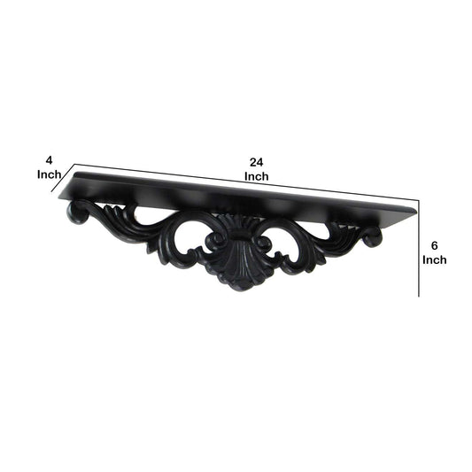 Hand Carved Wooden Wall Shelf With Floral Desig... Hand Carved Wooden Wall Shelf With Floral Design Display, Black By Benzara