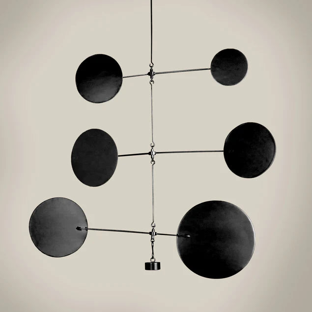 Our large spinning sculptural mobile is a longtime favorite. Made of heavy gauge iron with a intriguing satin black finish. Outdoor friendly but will rust with time and with changes in environments. Arrange the three layer components how you wish, assembly required. Multiple sets can be connected together. Set includes one each LG, MD, SM disc layer, two each 24"L and 12"L extension rods, two hooks and one weight for bottom. LOVE! Three colors available.
