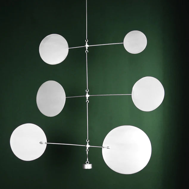 Our large spinning sculptural mobile is a longtime favorite. Made of heavy gauge iron with a calming satin white finish. Outdoor friendly but will rust with time and with changes in environments. Arrange the three layer components how you wish, assembly required. Multiple sets can be connected together. Set includes one each LG, MD, SM disc layer, two each 24"L and 12"L extension rods, two hooks and one weight for bottom. LOVE! Three colors available.
