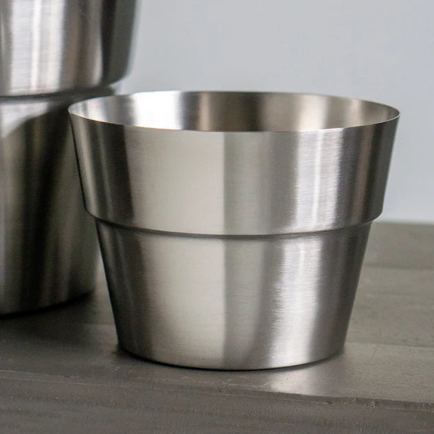 Our modern take on the simple classic planter shape that is perfect for any setting. Crafted by hand, the attractive hefty thick gauge stainless steel has an elegant, brushed exterior. Outdoor friendly but could slightly corrode with time especially in salty environments. Holds water. No hole in bottom. Two sizes available.