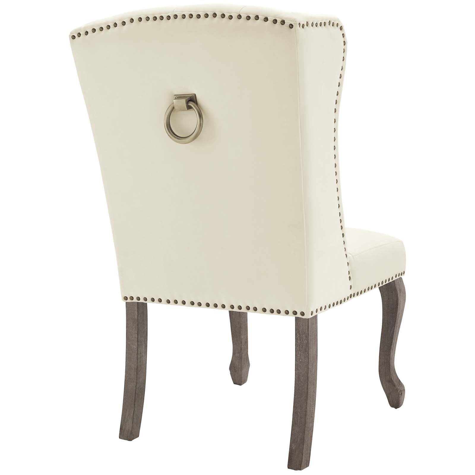 Bring French-inspired style and vintage charm to your living space with the Apprise Performance Velvet Dining Side Chair. Elegantly designed with deep-button tufting, a silver polished metal pull ring, classic nailhead trim, and weathered wood cabriole legs with chiseled artisan detail, this wingback chair makes a chic statement with timeless detail and modern farmhouse intrigue. Finely upholstered in stain-resistant performance velvet, with dense foam padding and a sinuous spring support system for a comfortable, supportive seat experience. Chair Weight Capacity: 300 lbs.