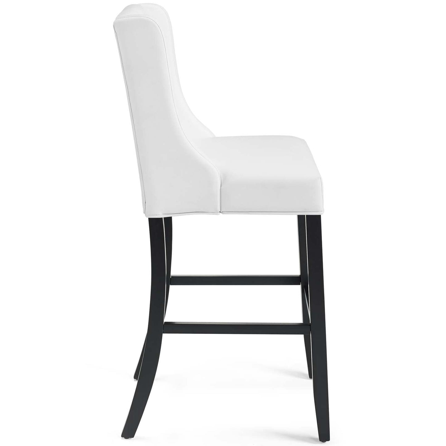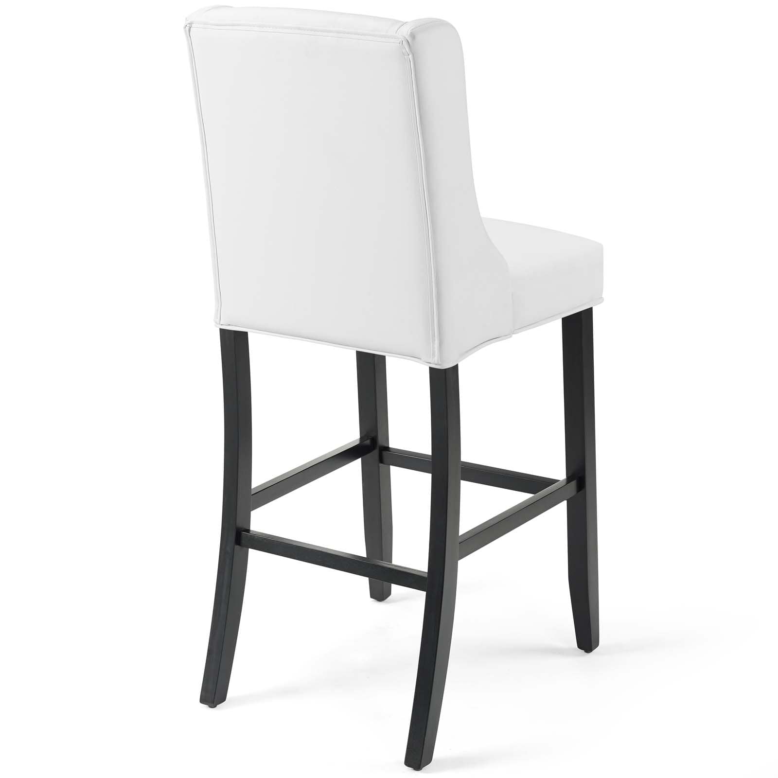 Bestow splendor with the Baronet Tufted Button Faux Leather Upholstered Bar Stool. Featuring dense foam padding, sinuous spring support, and smooth faux leather upholstery, enjoy a luxe seating experience with this luxurious tufted button bar stool. Complete with sleek curves and dignified form, this modern bar stool with solid wood legs with stretcher supports and non-marking foot caps is the perfect choice for the home bar seating area. Bar Stool Weight Capacity: 500 lbs.