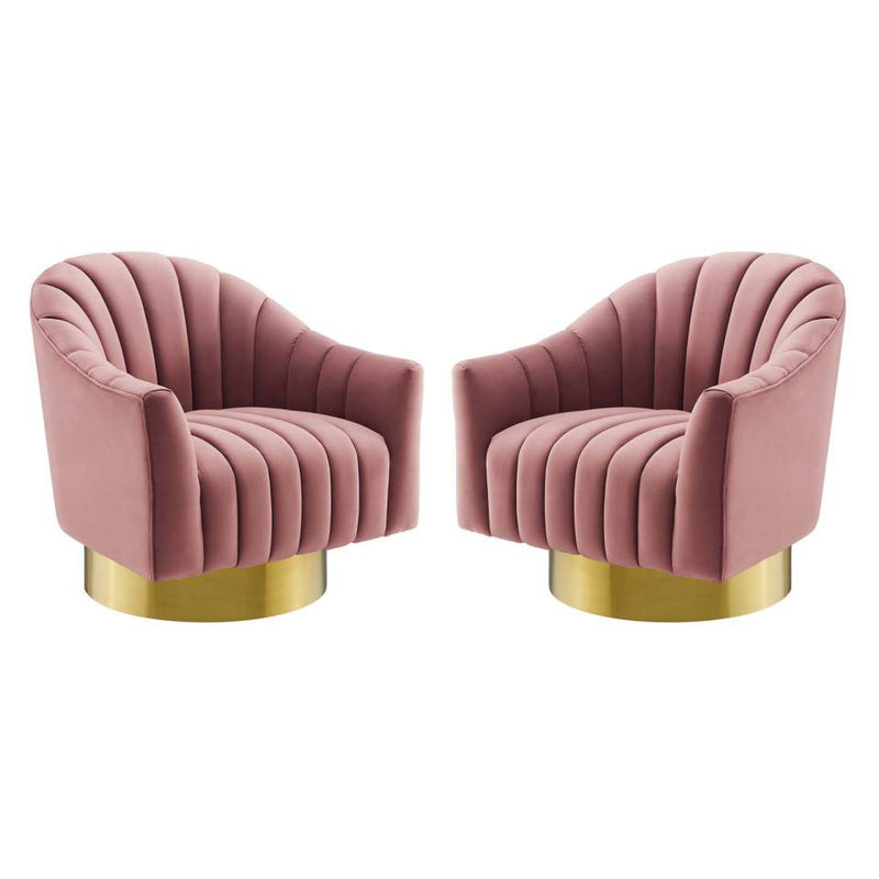 Elevate your leisure time and maneuver with effortless ease in this stunning swivel chair. The Buoyant accent lounge swivel chair features graceful curves slope gently downward as vertical channel tufting creates a visual cascade of elegant vintage glamour. Complete with soft, stain-resistant performance velvet upholstery and dense foam padding, Buoyant comes with a plush design perfect for a luxurious seating experience. Resting on a rotating gold stainless steel base, this luxurious swivel chair makes it easy to maneuver to your position of choice. Enjoy the entirety of your surroundings with this upholstered swivel chair perfect for your living room, entryway, bedroom, or lounge area. Set Includes: Two - Buoyant Swivel Chair
