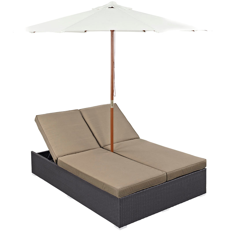 Gather stages of sensitivity with the Convene Outdoor Sectional series. Made with a synthetic rattan weave and a powder-coated aluminum frame, Convene Patio Double Lounge Chair is a versatile outdoor collection that shifts and combines according to the spontaneous needs of the moment. Outfitted with all-weather fabric cushions, this double deck chair leaves a positive impression on friends and family while enhancing your patio, backyard, or poolside repast in this series of palpable distinction. This installment of the series is an Outdoor Reclining Patio Chaise with Umbrella.