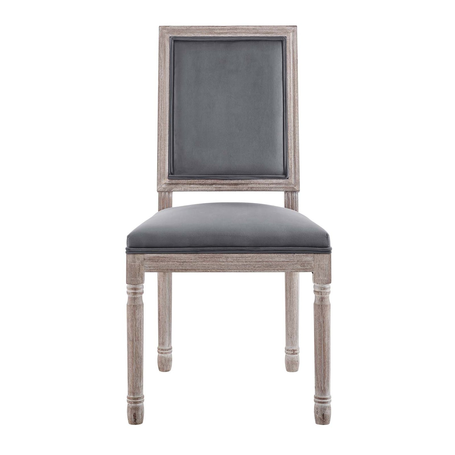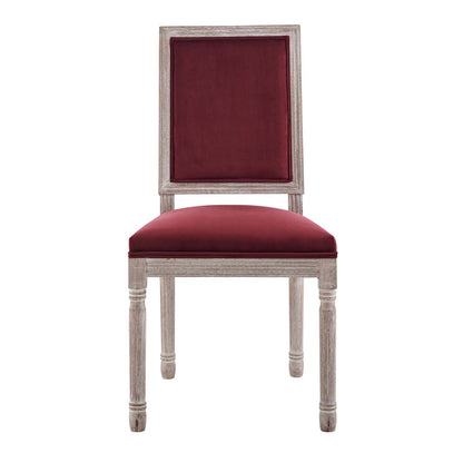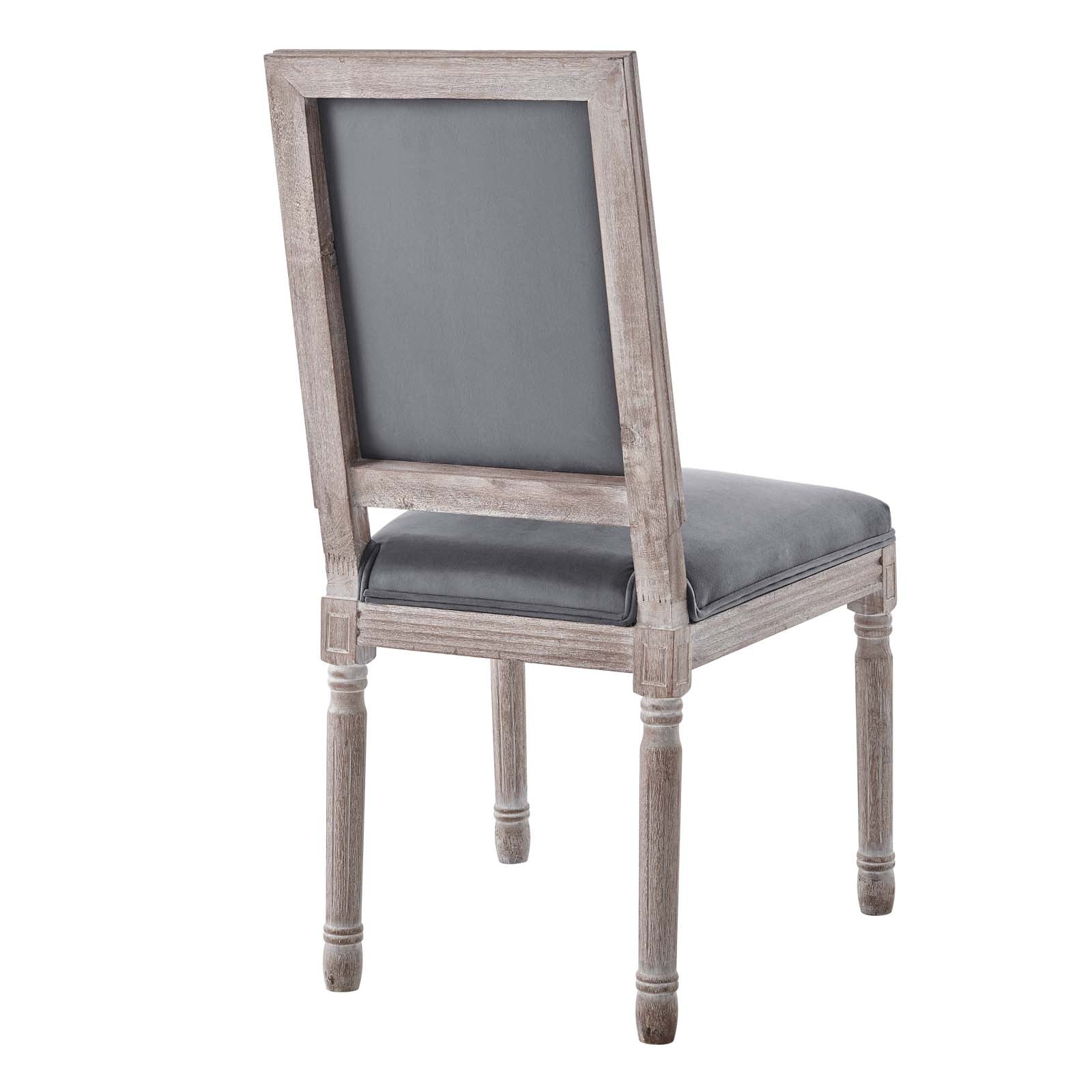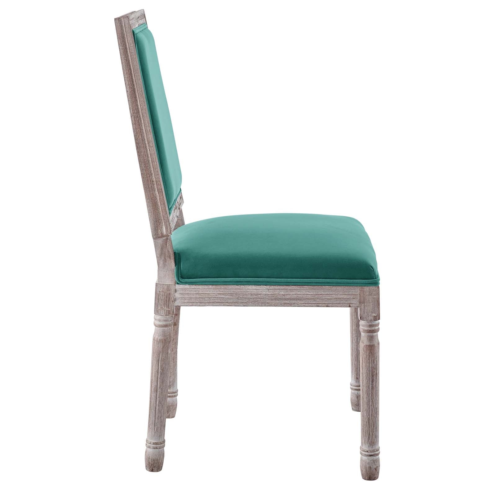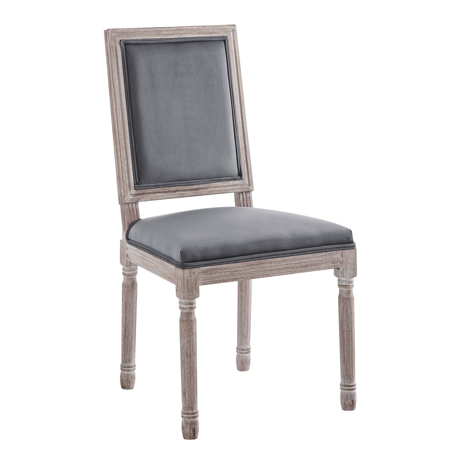 Revel in the whispered opulence of the Court Dining Side Chair. Featuring a fluted wood frame, dense foam upholstered performance velvet seat with elegant welting, this square back dining or accent chair harmoniously blends old world charm with modern intrigue. Designed with a vintage French look and an undeniable appeal, this velvet chair supports up to 331 pounds and comes with foot pads to preserve flooring. Comes fully assembled.