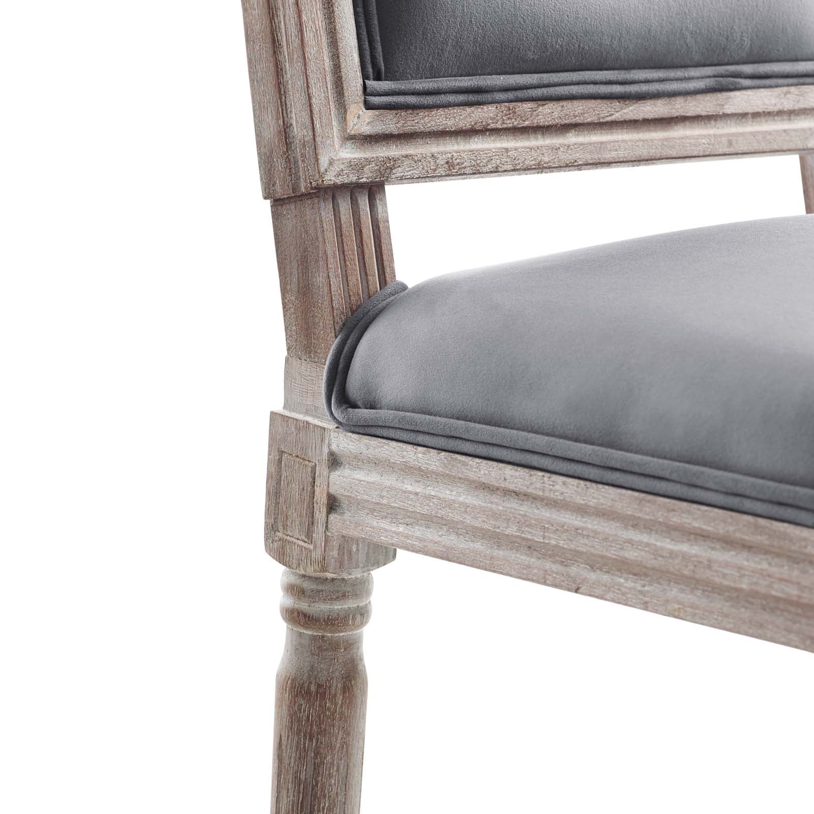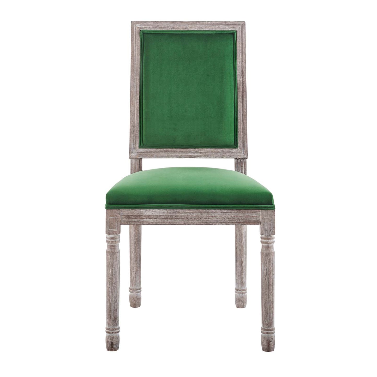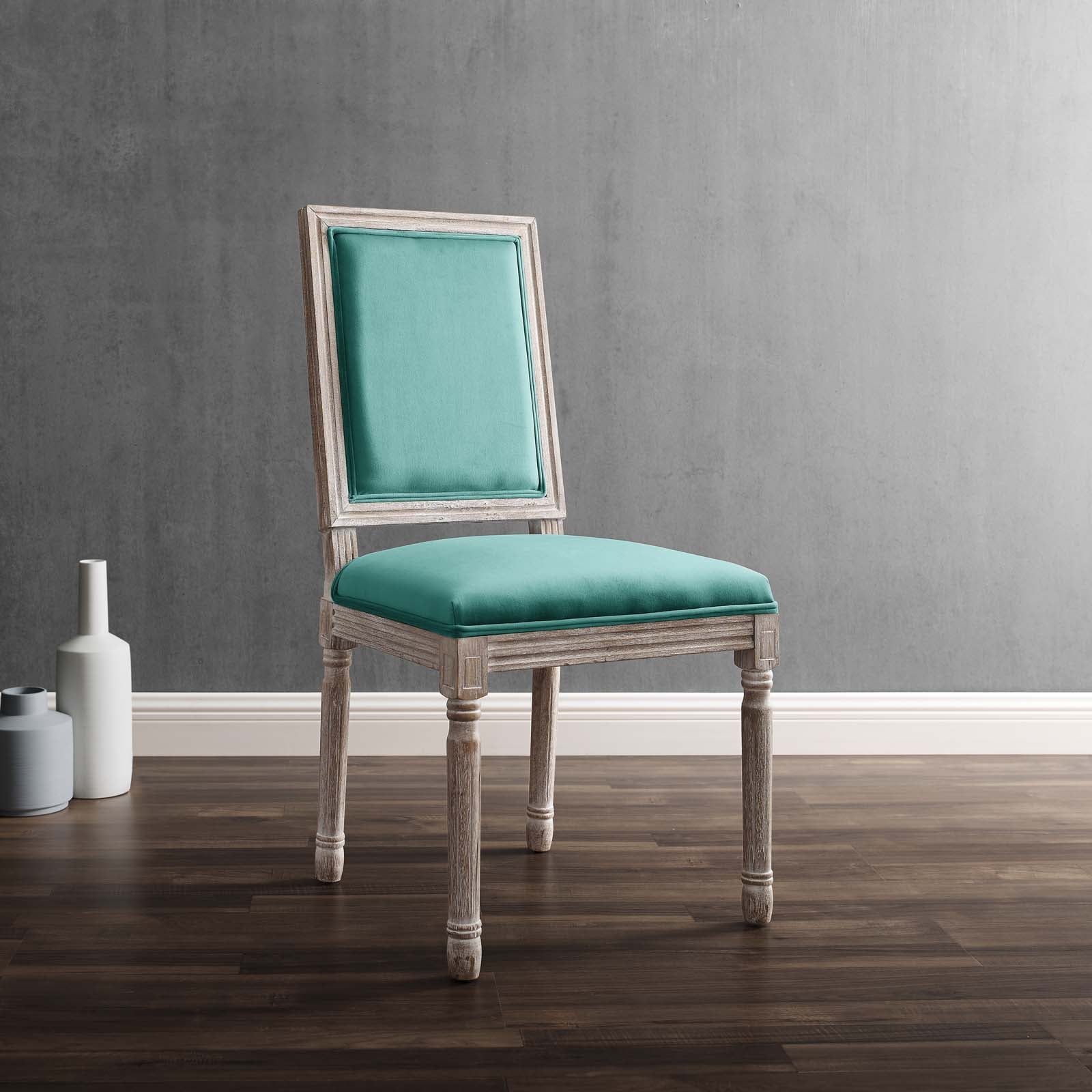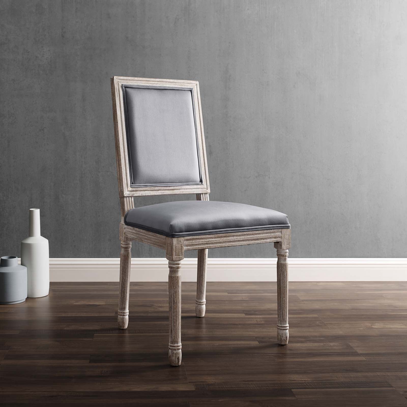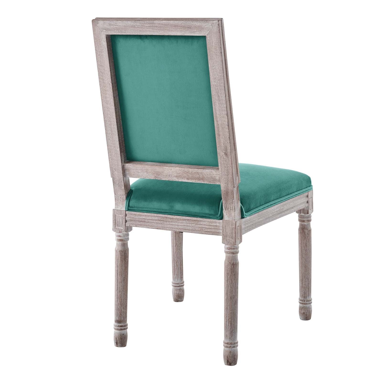 Revel in the whispered opulence of the Court Dining Side Chair. Featuring a fluted wood frame, dense foam upholstered performance velvet seat with elegant welting, this square back dining or accent chair harmoniously blends old world charm with modern intrigue. Designed with a vintage French look and an undeniable appeal, this velvet chair supports up to 331 pounds and comes with foot pads to preserve flooring. Comes fully assembled.