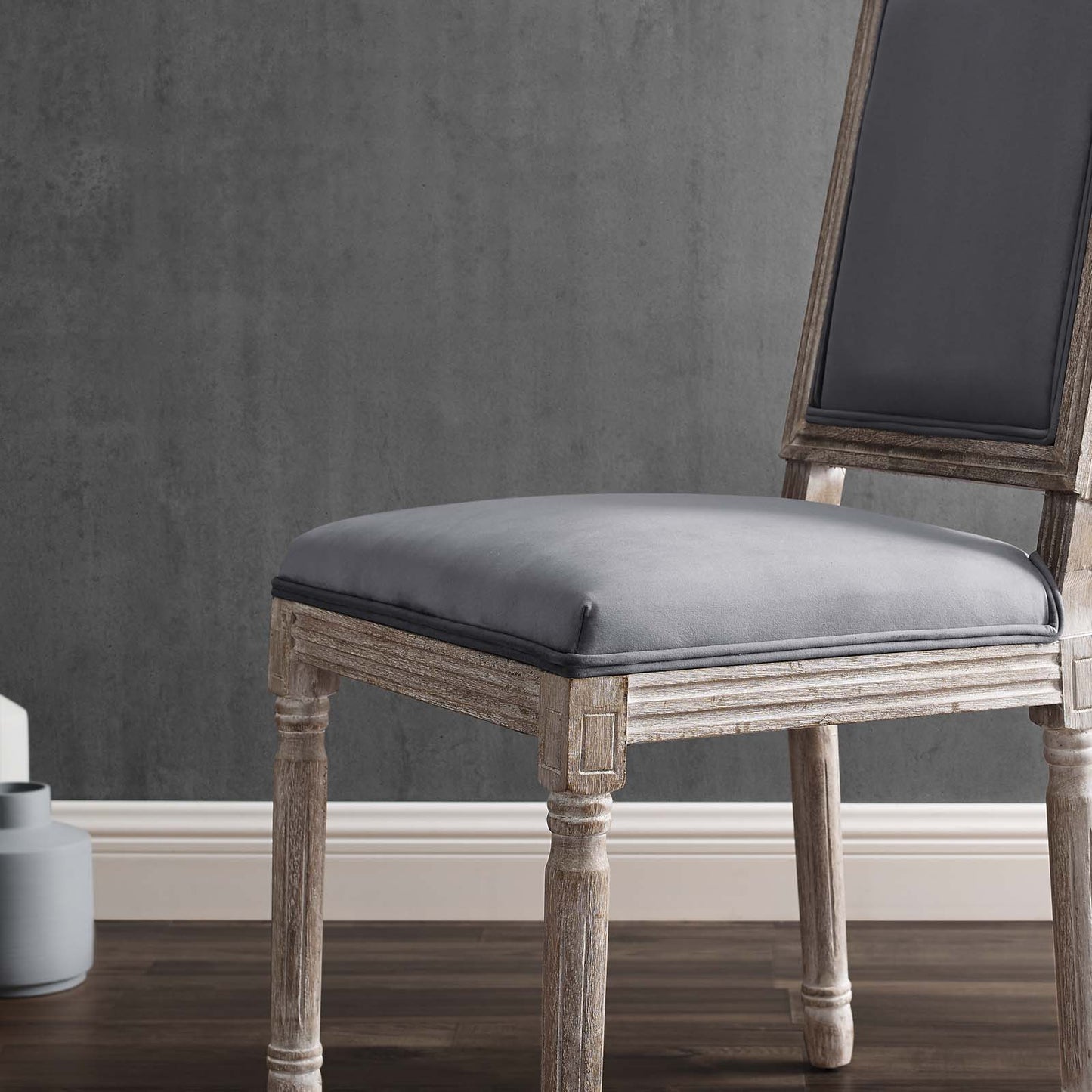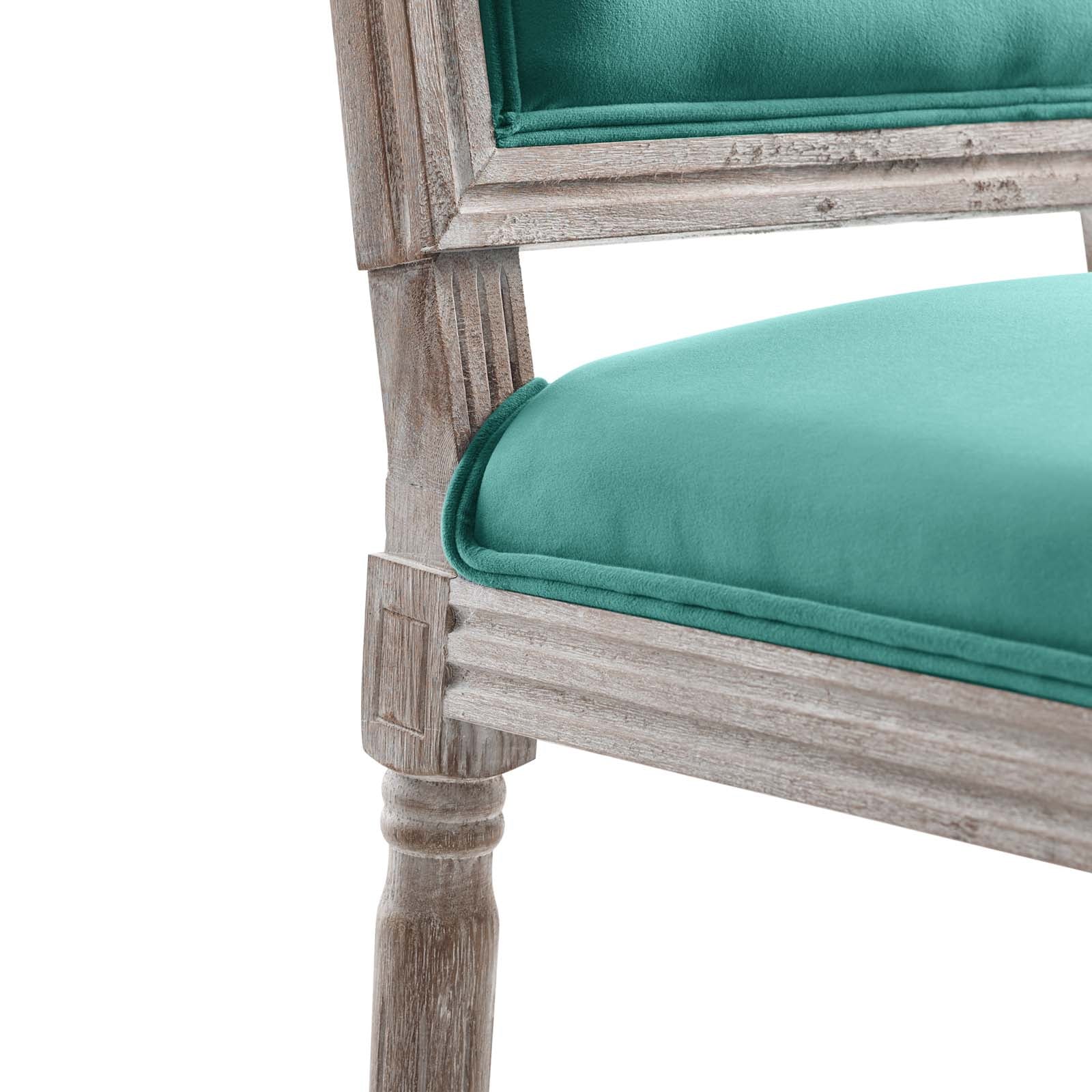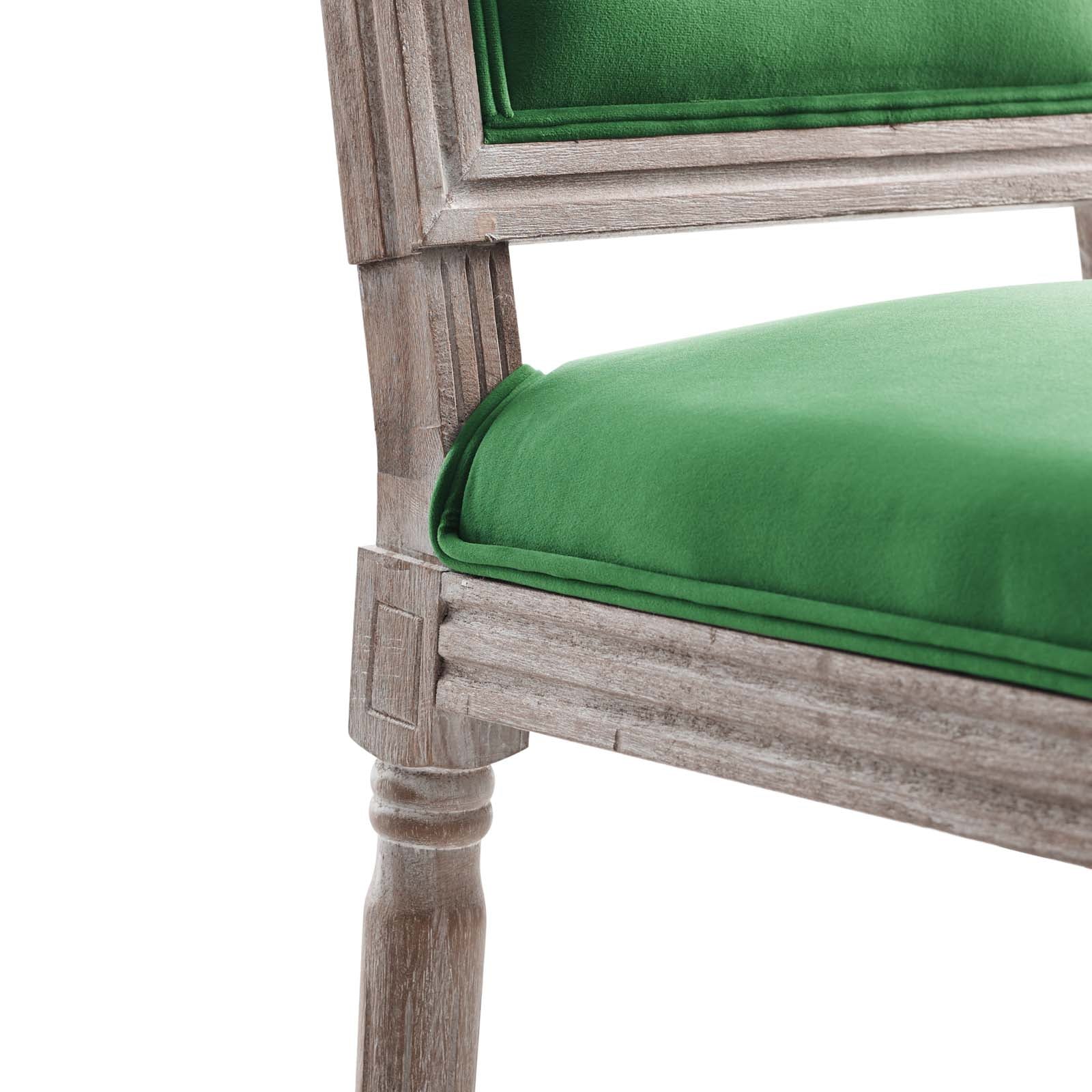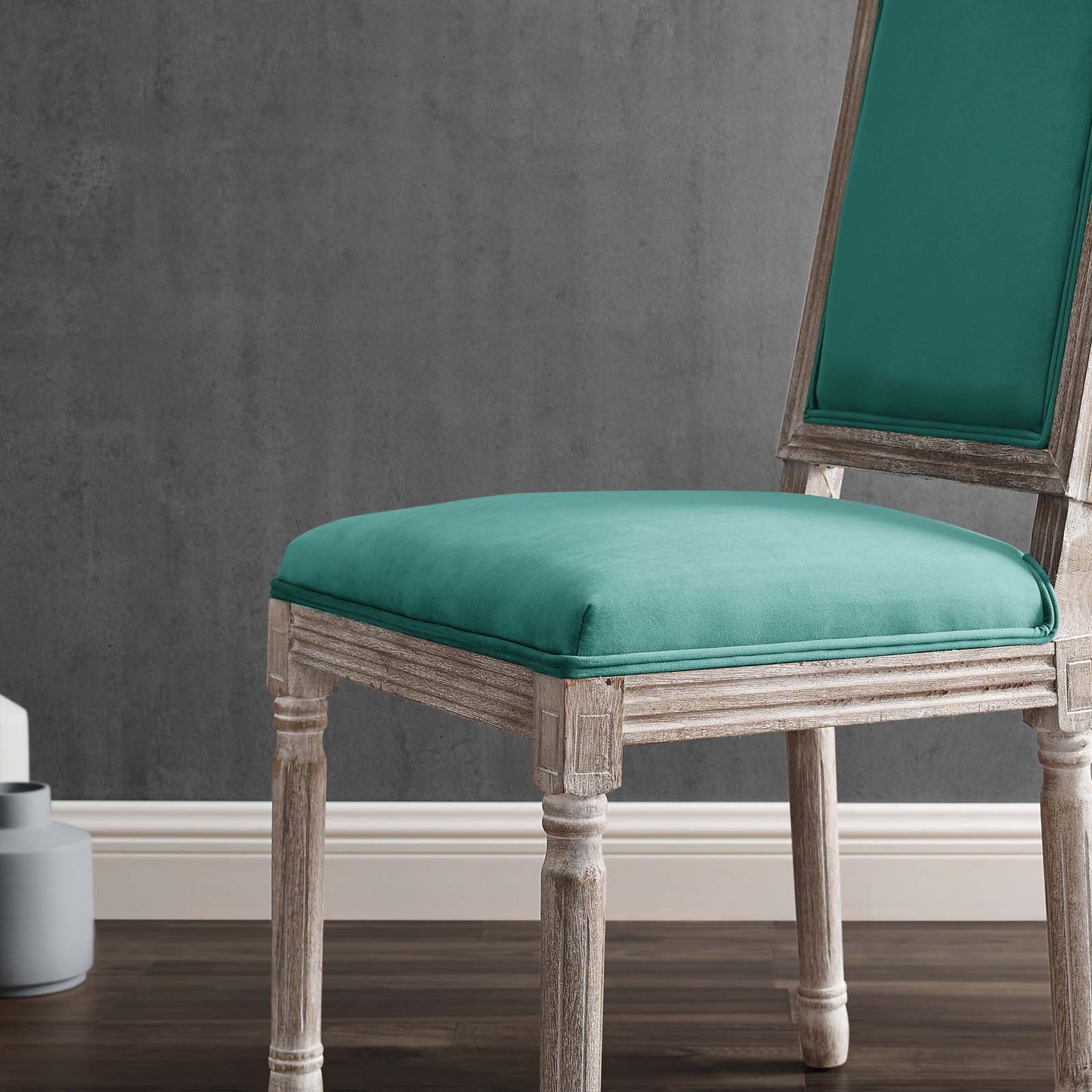 Revel in the whispered opulence of the Court Dining Side Chair. Featuring a fluted wood frame, dense foam upholstered performance velvet seat with elegant welting, this square back dining or accent chair harmoniously blends old world charm with modern intrigue. Designed with a vintage French look and an undeniable appeal, this velvet chair supports up to 331 pounds and comes with foot pads to preserve flooring. Comes fully assembled.