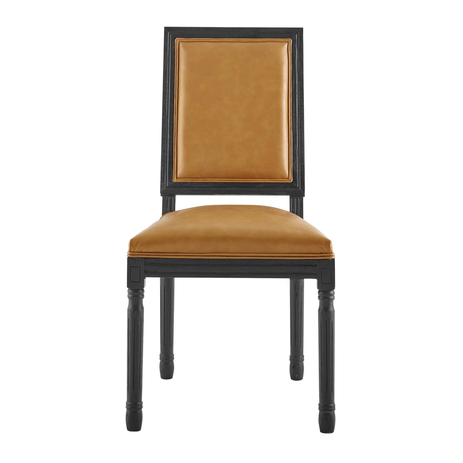 Revel in the whispered opulence of the Court Dining Side Chair. Featuring a fluted wood frame, dense foam upholstered vegan leather seat with elegant welting, this square back dining or accent chair harmoniously blends old world charm with modern intrigue. Designed with a vintage French look and an undeniable appeal, Court supports up to 331 pounds and comes with foot pads to preserve flooring. Comes fully assembled.