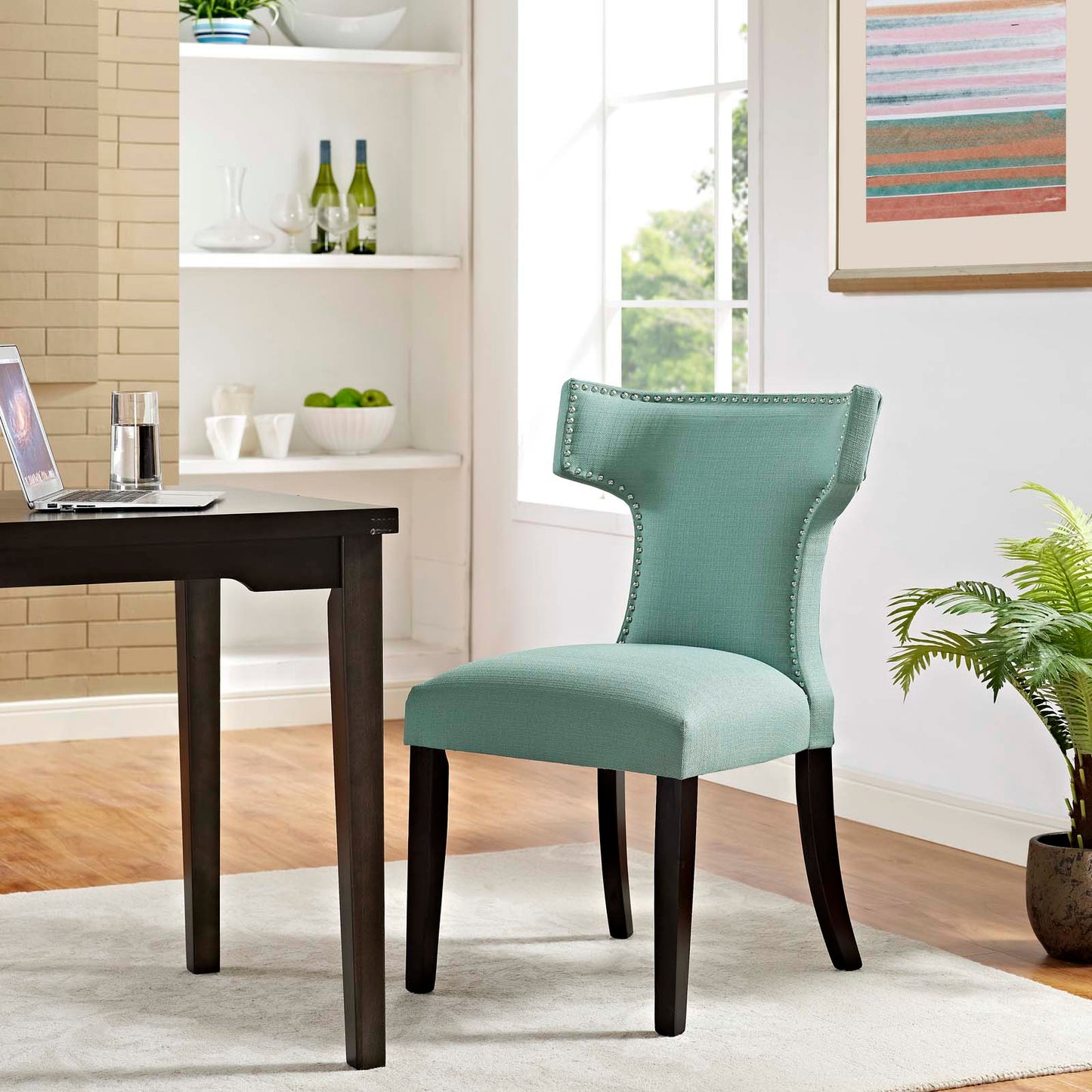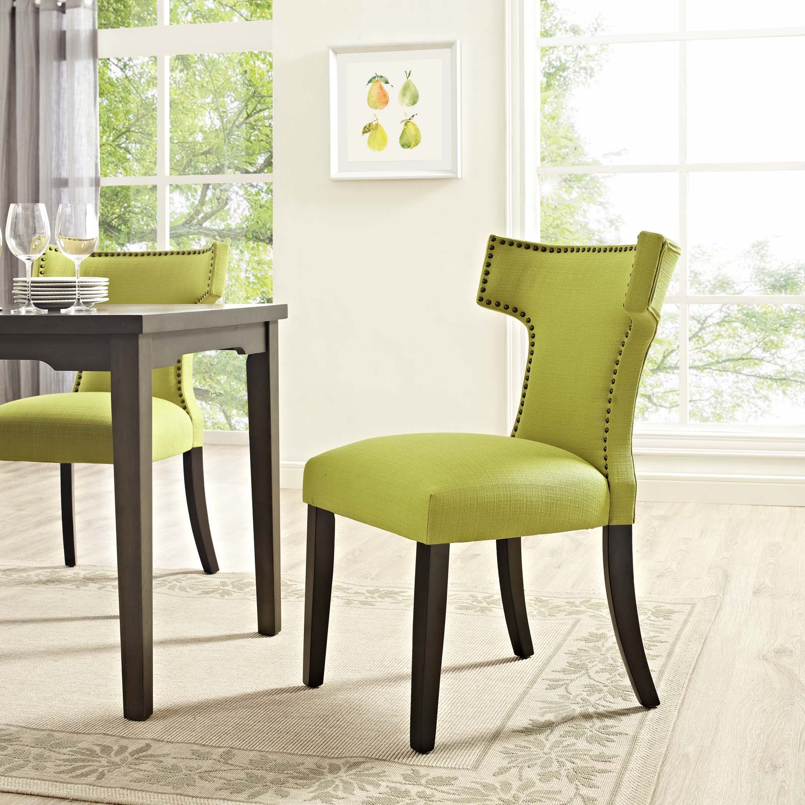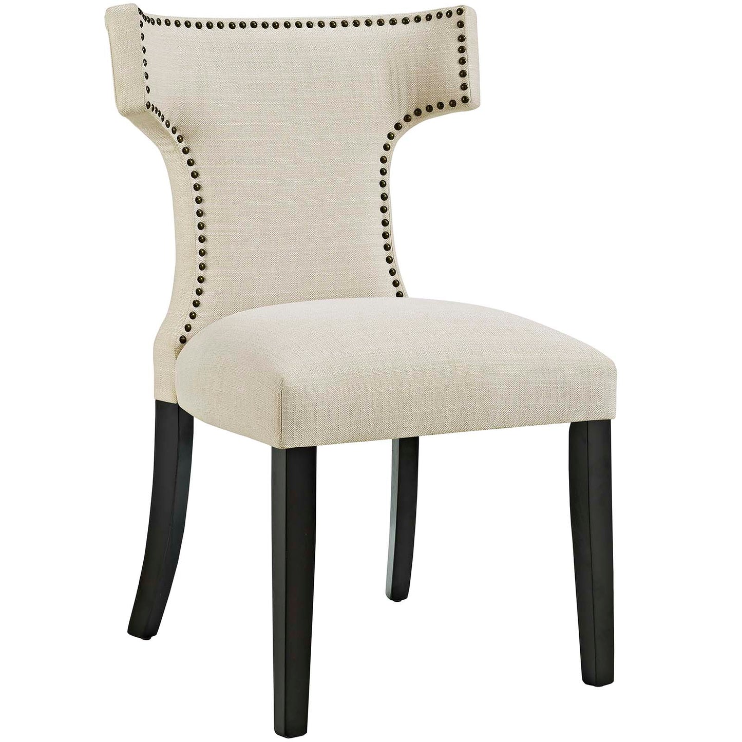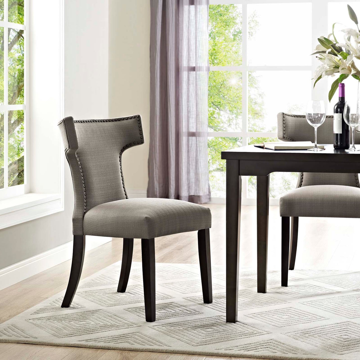 Transform your dining décor with the broadly designed Curve Dining Side Chair. Sweeping lines complement a minimalist shape for a chic look studded with nailhead trim. Curve comes generously padded with dense foam covered in polyester fabric, non-marking foot caps, and delivers just the right touch of finesse with tapered wood legs. Sporting an hourglass shape, Curve works well in a variety of dining room arrangements.