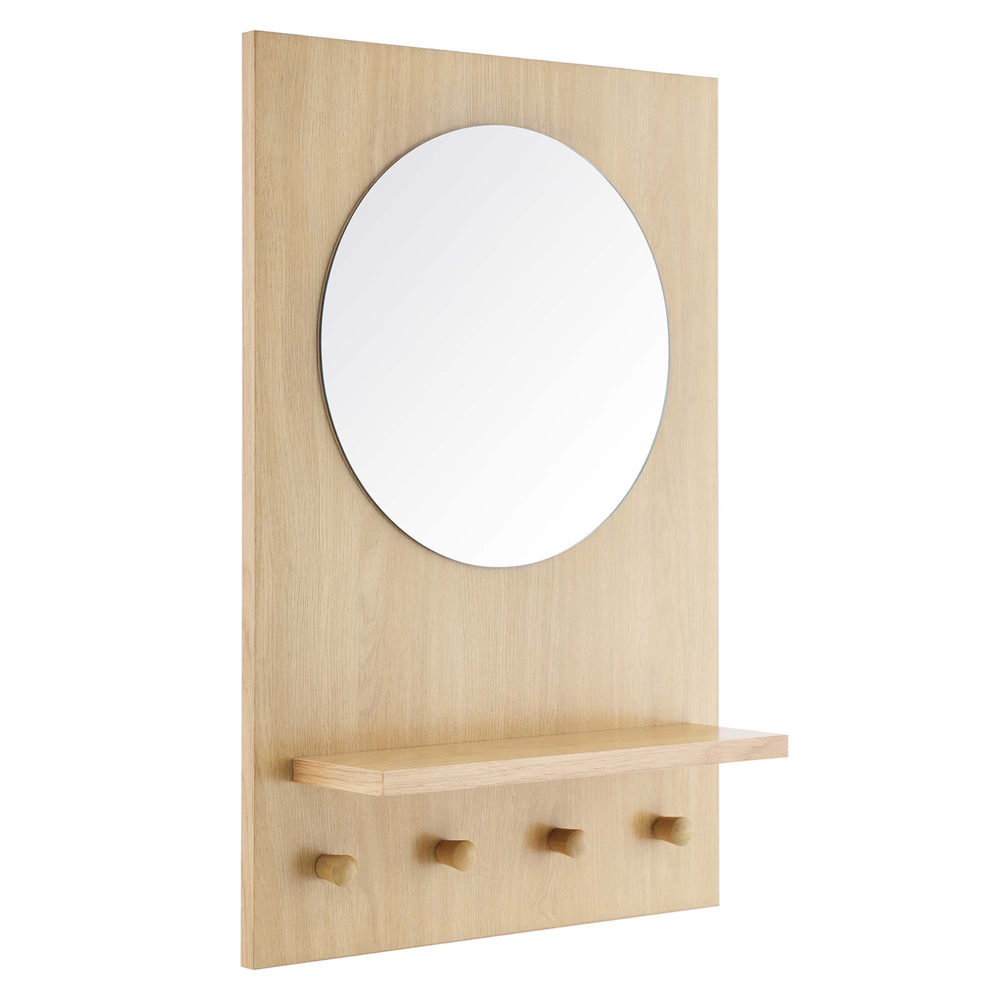 A good combination of form and function, Glint is a stunning round mirror with a rectangular wood frame, shelf, and four pegs, and is a must-have for the entryway, hallway, or mudroom. Not only does it offer a touch of modern style and elegance, but it also provides organization and storage for keys, dog leashes, hats, and a variety of other small items. Crafted from mindi wood and particleboard with a wood grain laminate, this all-in-one wall mirror is made to last and brings an extra touch of character to any home or apartment. Its sleek, modern design and wood grain aesthetics are sure to turn heads and make a statement. Minimal assembly required.