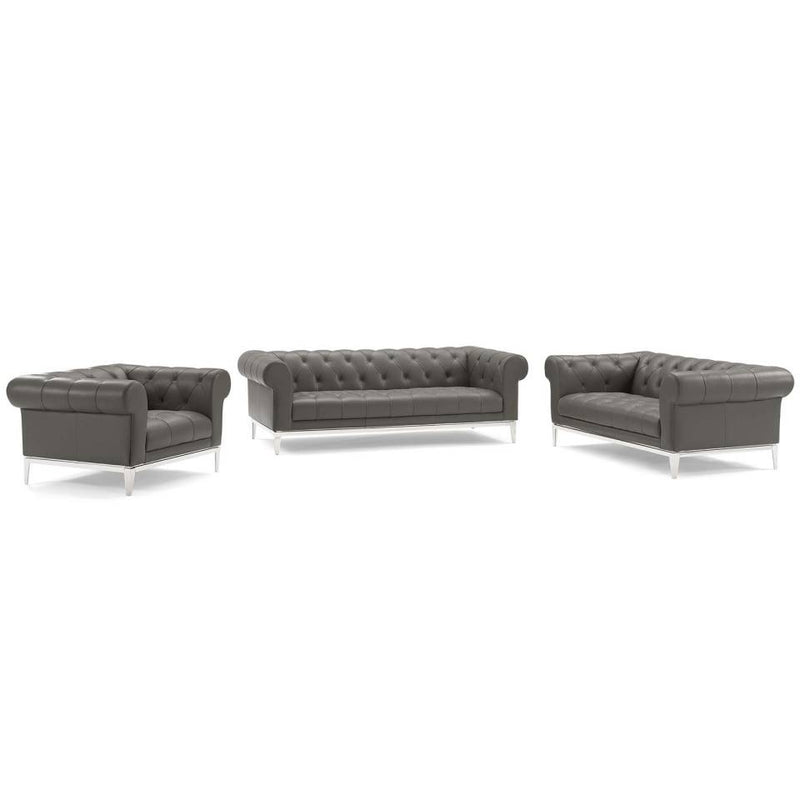 Rollick in the luxurious expanse of the Idyll Leather Chesterfield 3 Piece Set which includes Sofa, Loveseat, and Armchair. Featuring soft leather upholstery, rolled arms and tufted button accent details, dense foam padding, and a sinuous spring system for responsive support, Idyll creates a lushly comfortable seating environment that invites lingering conversations and leisure time. Supported by a sturdy polished stainless steel frame, enhance your living room decor with the timeless look of this vintage set.