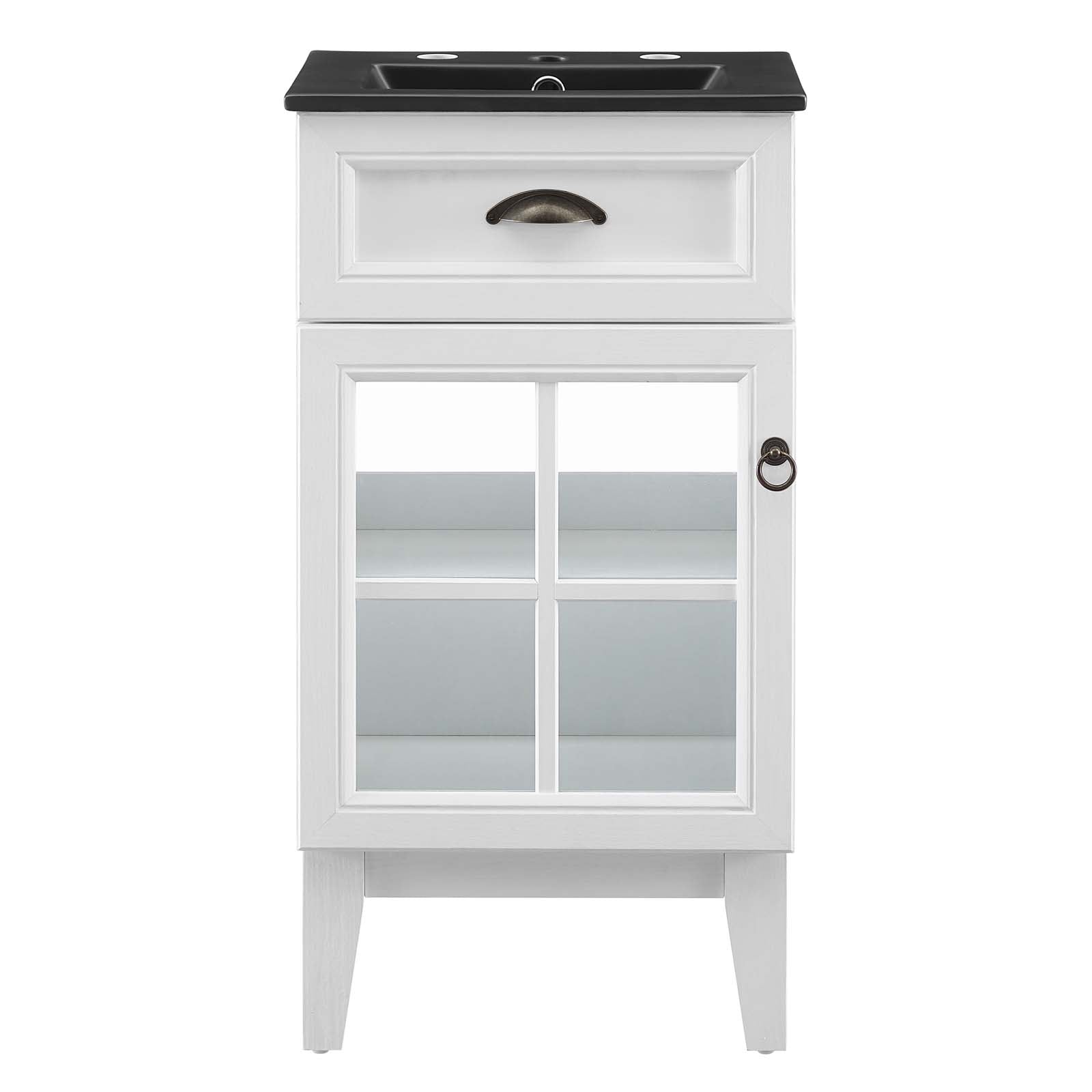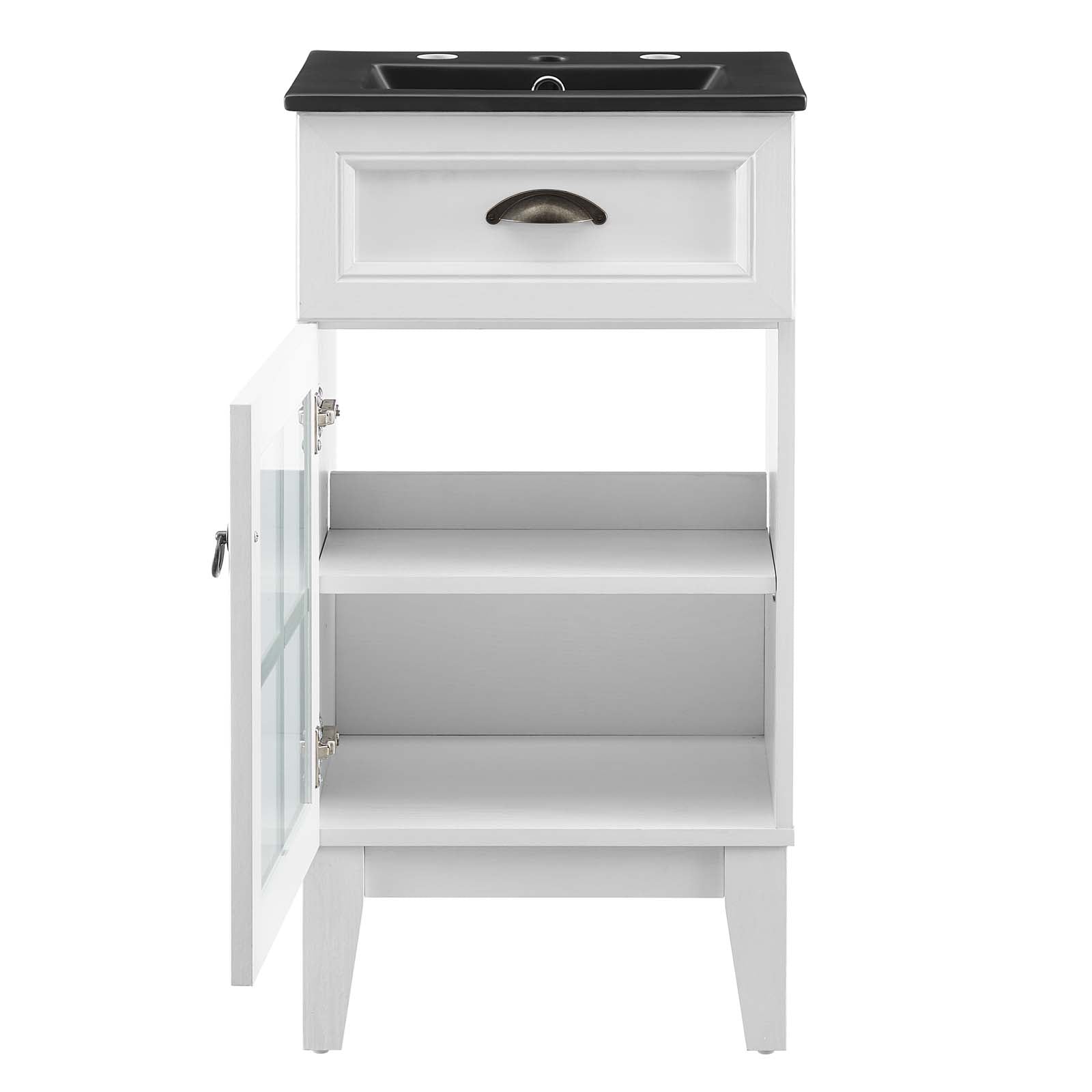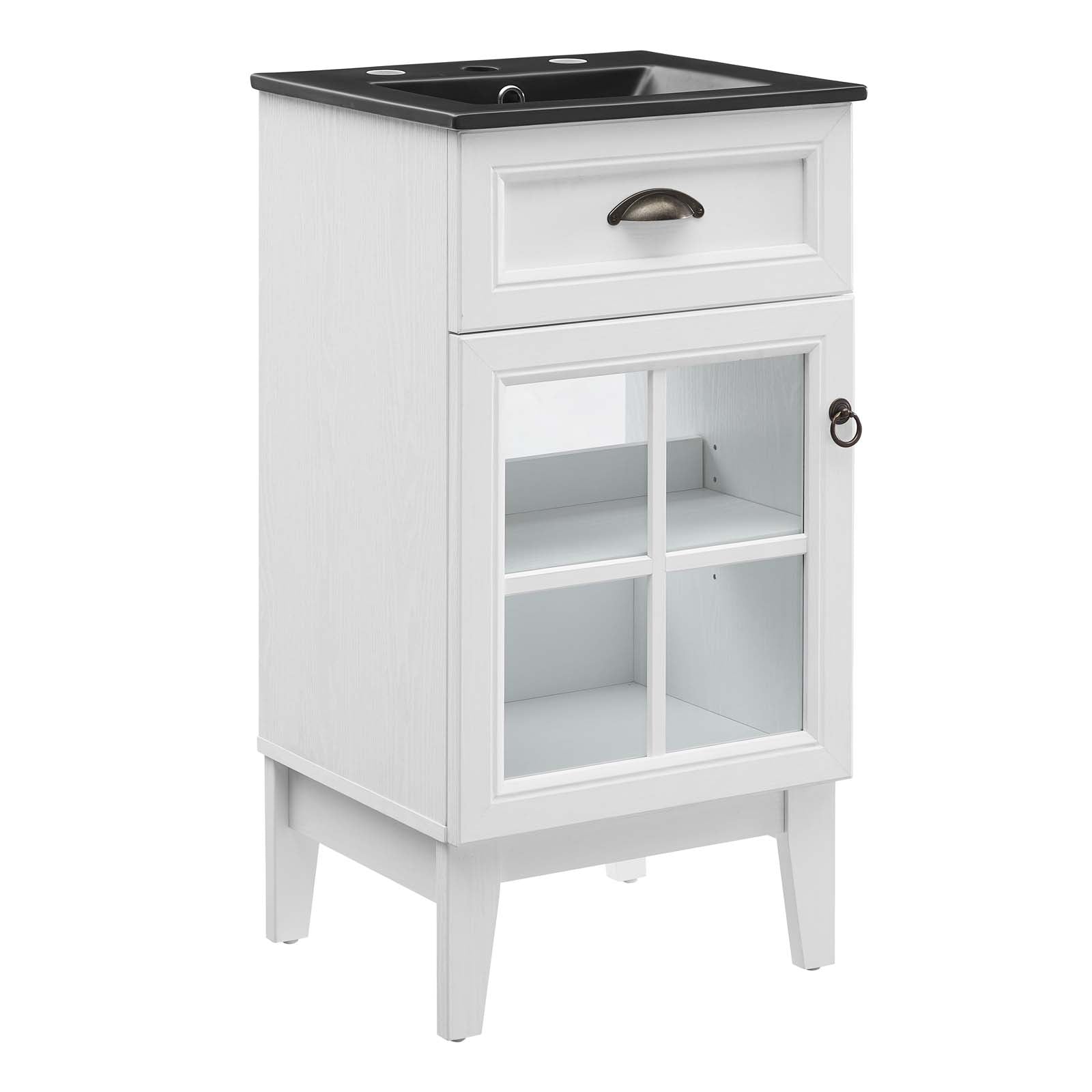 Invite the provincial charm of the Isle 18" Bathroom Vanity Cabinet to transform your bathroom space. Made of sturdy particleboard and MDF, Isle’s coastal contemporary design features a fixed drawer and an adjustable shelf for under-sink storage behind a glass windowpane door. A curved ceramic sink basin with an integrated countertop and 8" centerset faucet holes brings stylish functionality to this bathroom vanity. With a solid construction, this bathroom vanity cabinet brings contemporary design and coastal style to your bathroom space.
