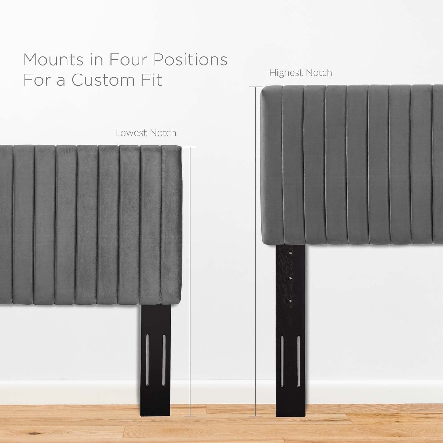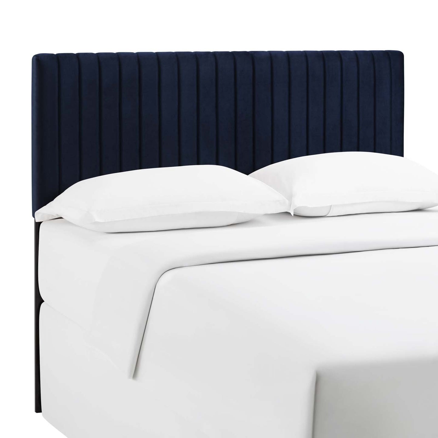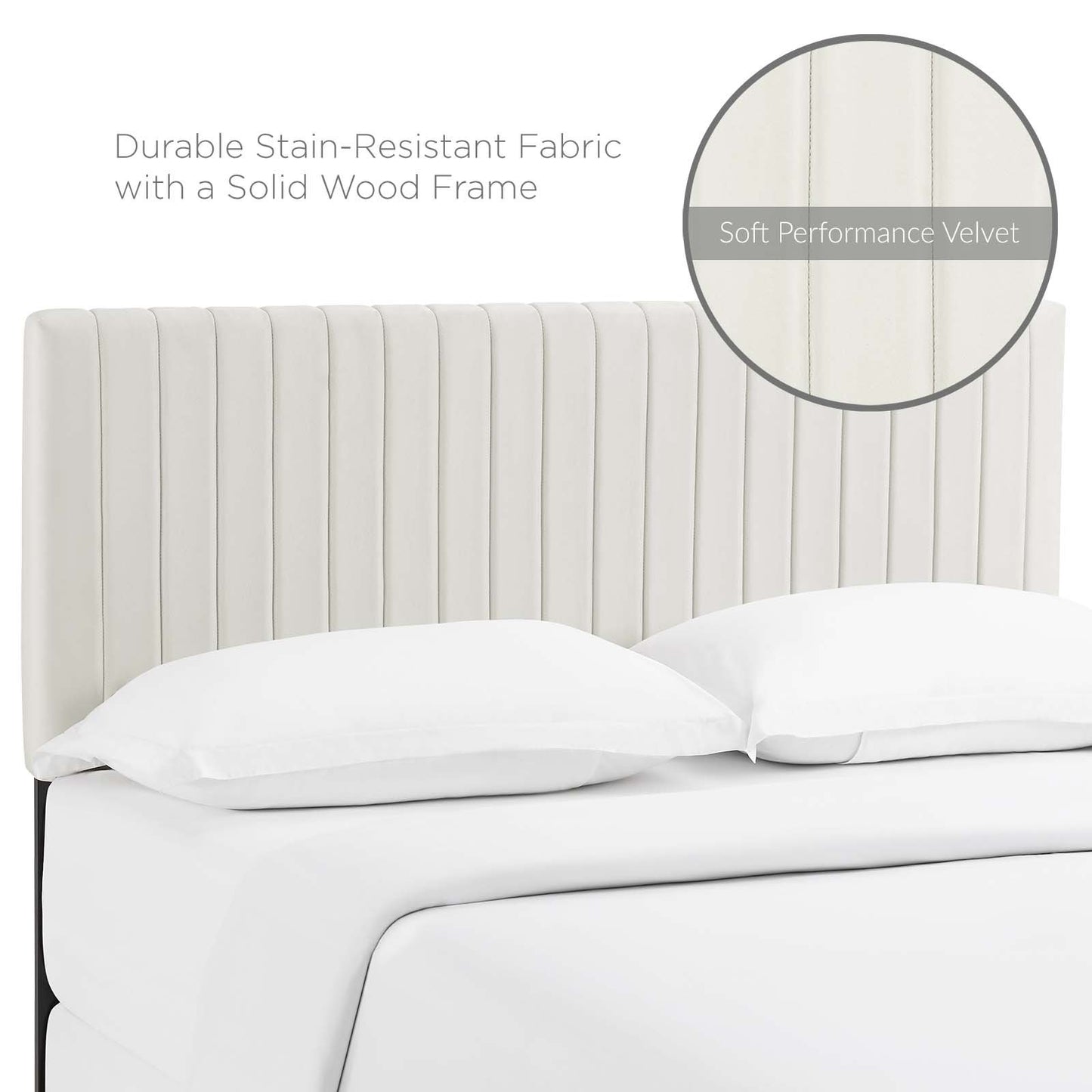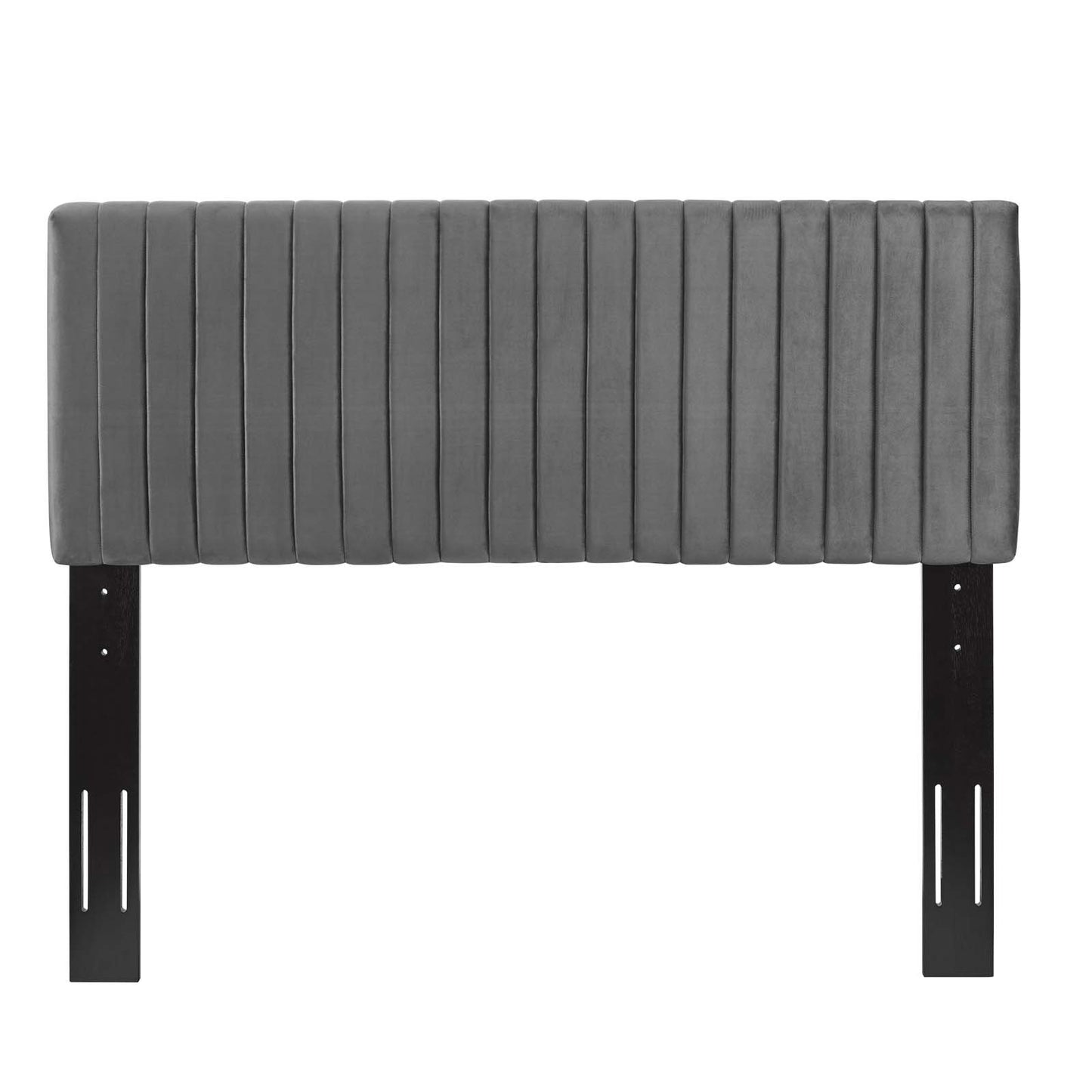 Refresh your master bedroom or guest suite with the Keira Full/Queen Headboard. This elegant queen headboard makes a luxe statement with its channel tufting, velvet texture, and chic squared profile. Boasting a modern design with timeless appeal, this upholstered headboard is covered in soft performance velvet made of stain-resistant polyester and features a solid wood and particleboard construction that’s durable and long-lasting. Lean back and relax while reading or watching TV in bed with the dense foam padding on this upholstered queen headboard. Fits queen and full size beds.