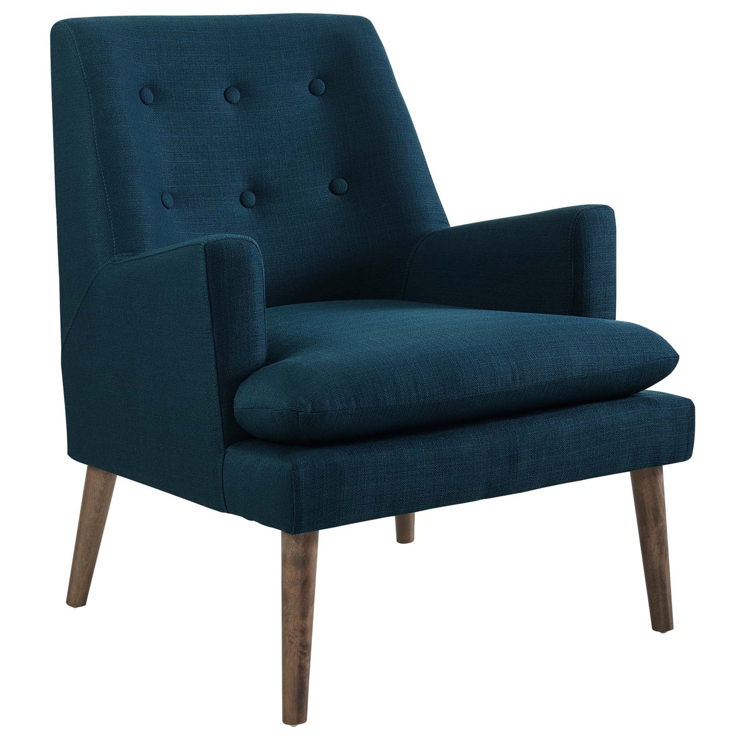 Unwind from daily stresses in the welcoming arms of the mid-century modern Leisure Lounge Chair. Leisure’s high-density foam seat and button tufted back surround you with comfort. Whether curled up with a favorite novel or entertaining guests, with flared armrests and a striking silhouette, Leisure will stand out as a modern beacon of stylish repose. Outfitted with four walnut-stained wood dowel legs with non-marking foot pads and soft polyester fabric upholstery, Leisure complements a living room, lounge space or bedroom and supports up to 331 pounds.