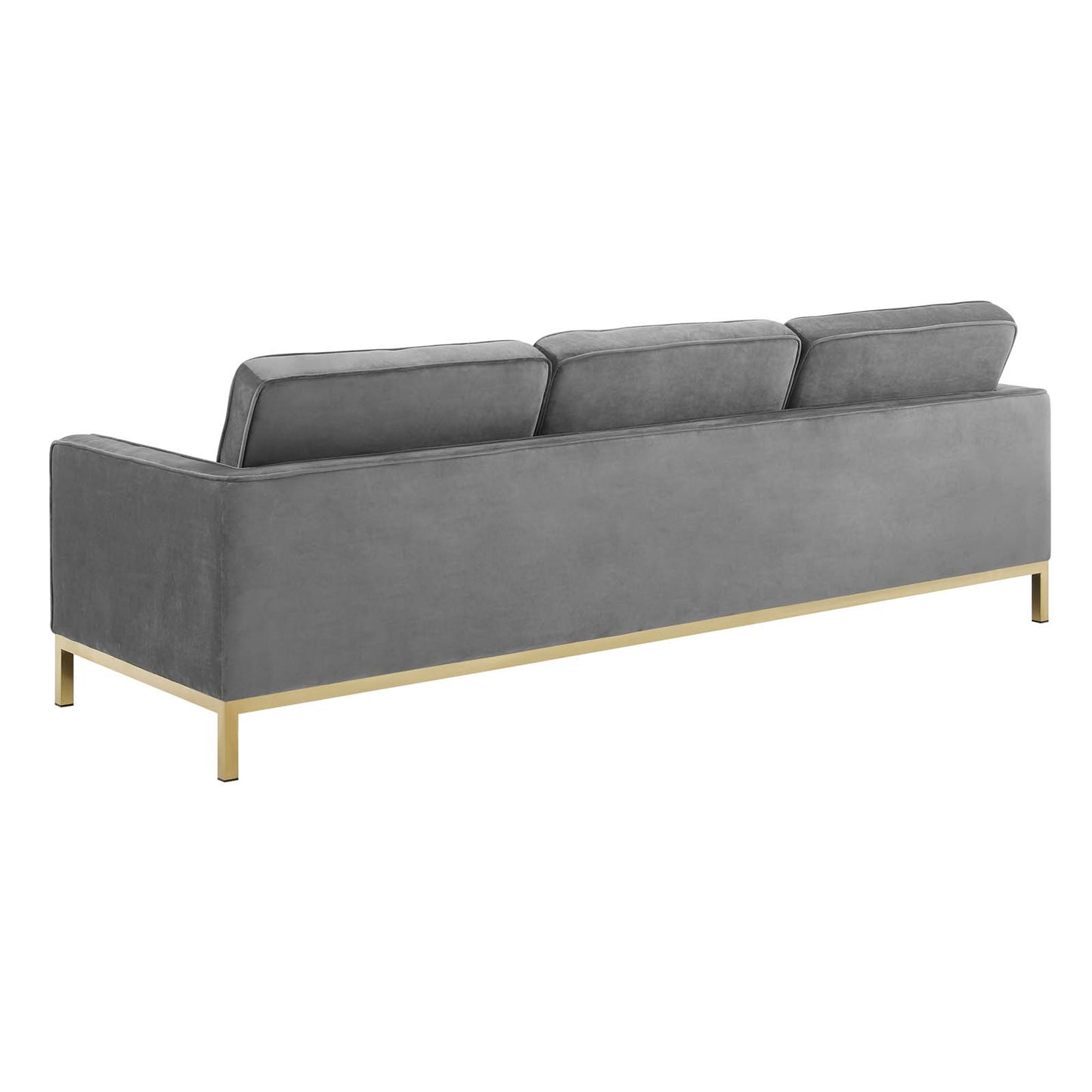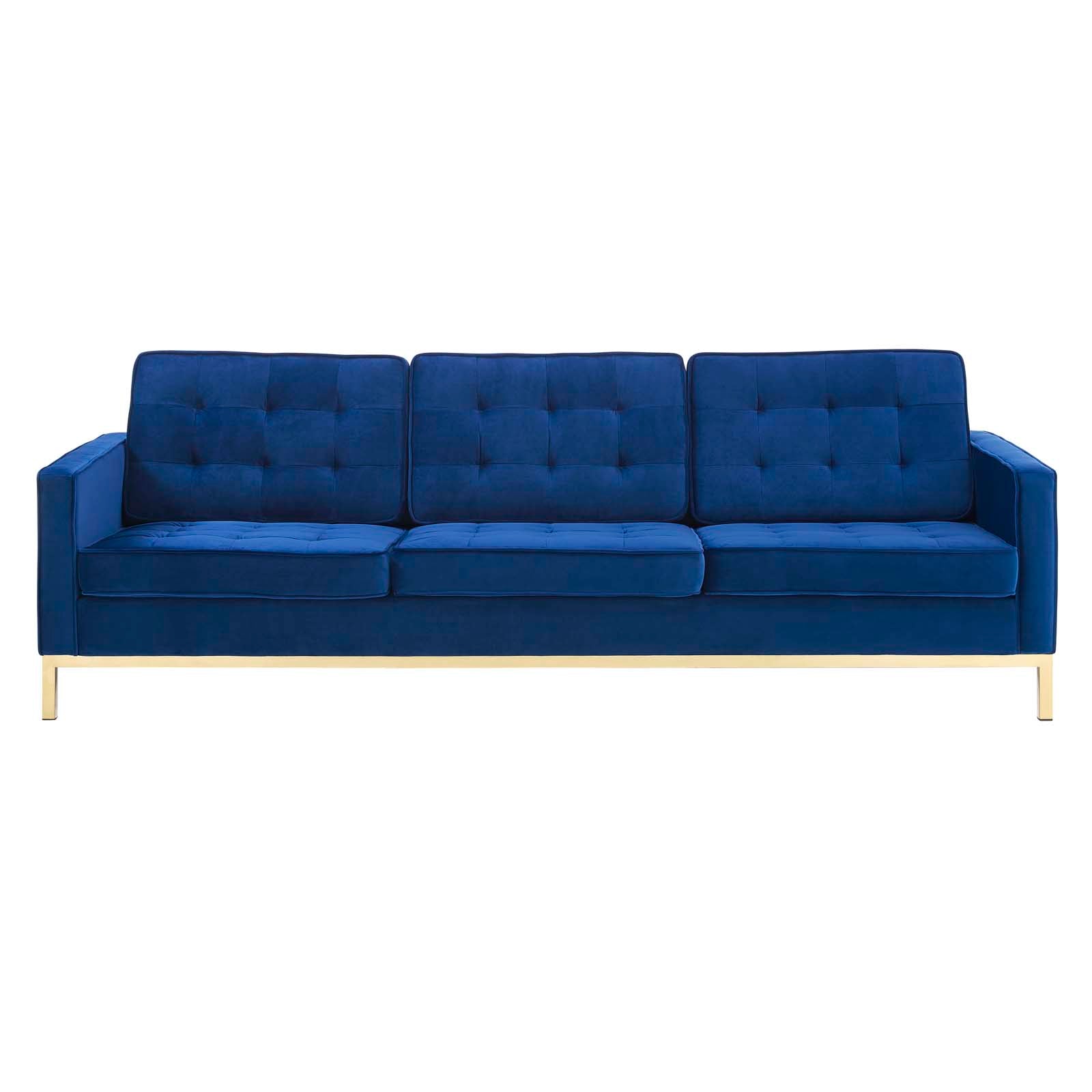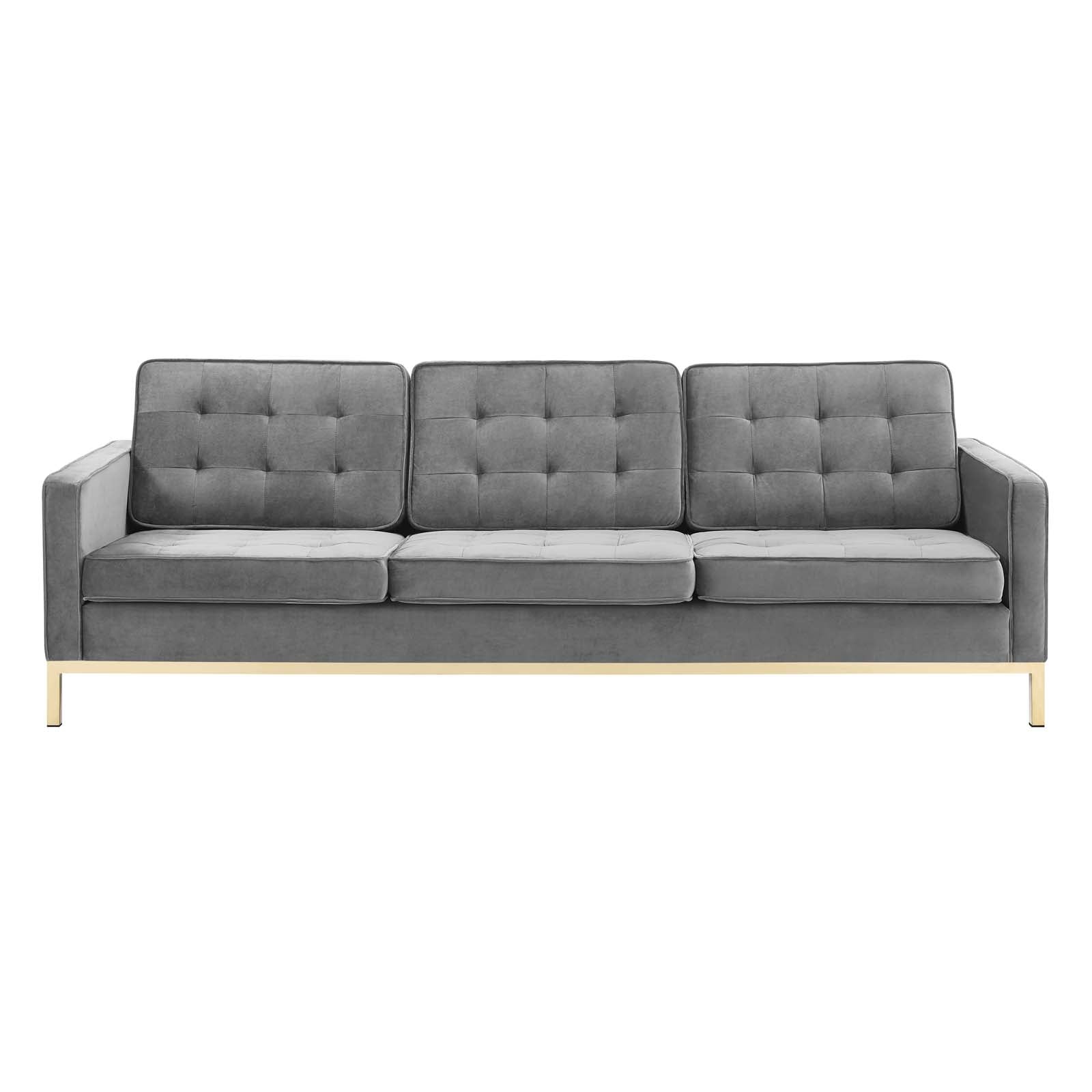 Revolutionize your living room furniture with the iconic Loft Button Tufted Performance Velvet Sofa. Adding visual depth to your living room or lounge space, Loft features soft and durable performance velvet upholstery accented in elegant button tufting. This modern living room sofa comes in a captivating linear design with an external tubular stainless steel frame, four gold stainless steel legs, and non-marking foot caps. Inspired by the richness of mid-century modern style, Loft is the preferred choice of living rooms and lounge spaces. Sofa Weight Capacity: 900 lbs.