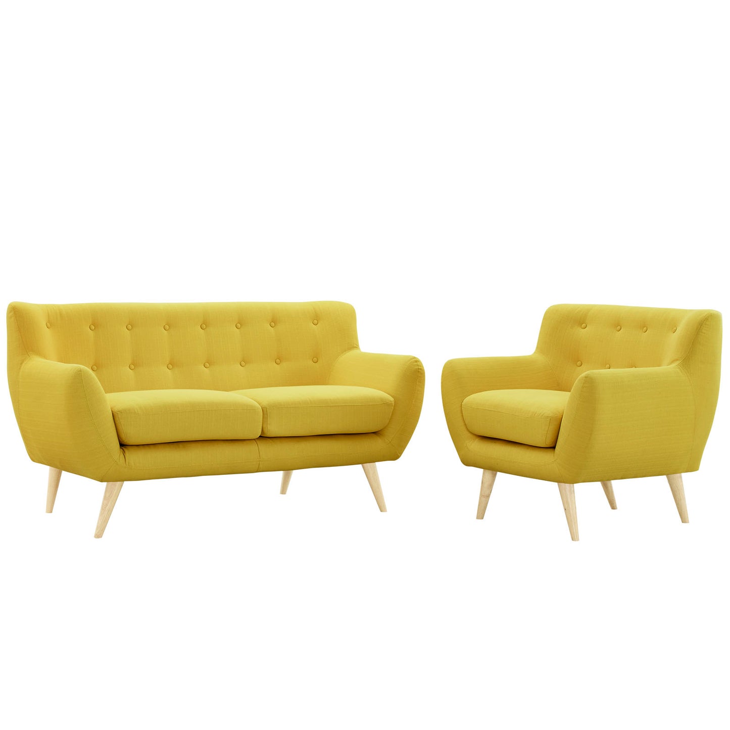 Take notice and engage your sensibilities with this plush dual cushion, organically shaped Living Room Set. Remark is gracefully positioned on solid natural wood dowel legs designed according to mid-century sentiments. Whether settling in with coffee and brunch, or entering a spirited discussion with friends, Remark’s polyester upholstery, two rows of finely stitched back seat buttons, and organic form ensure an eye-catching appeal at every turn.