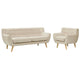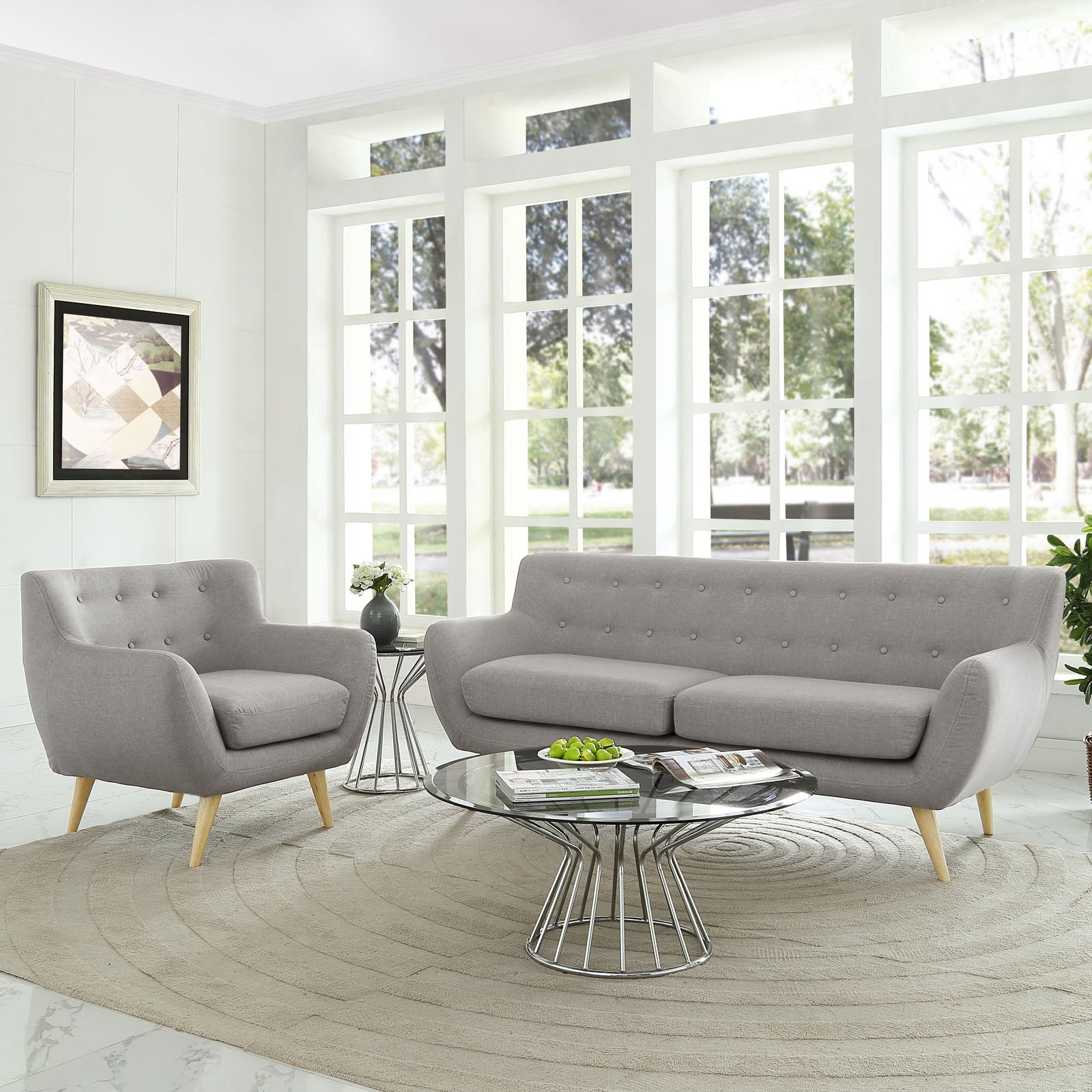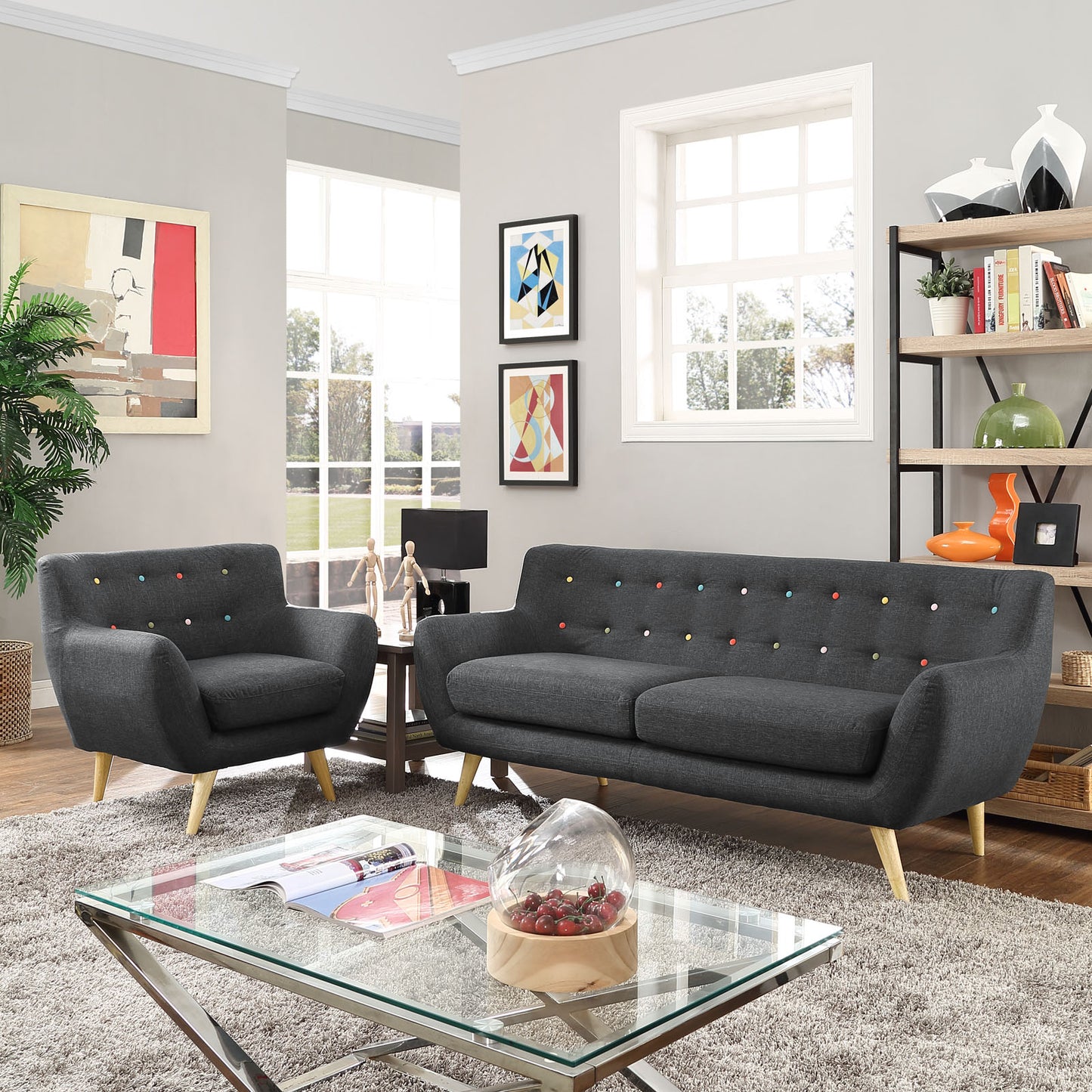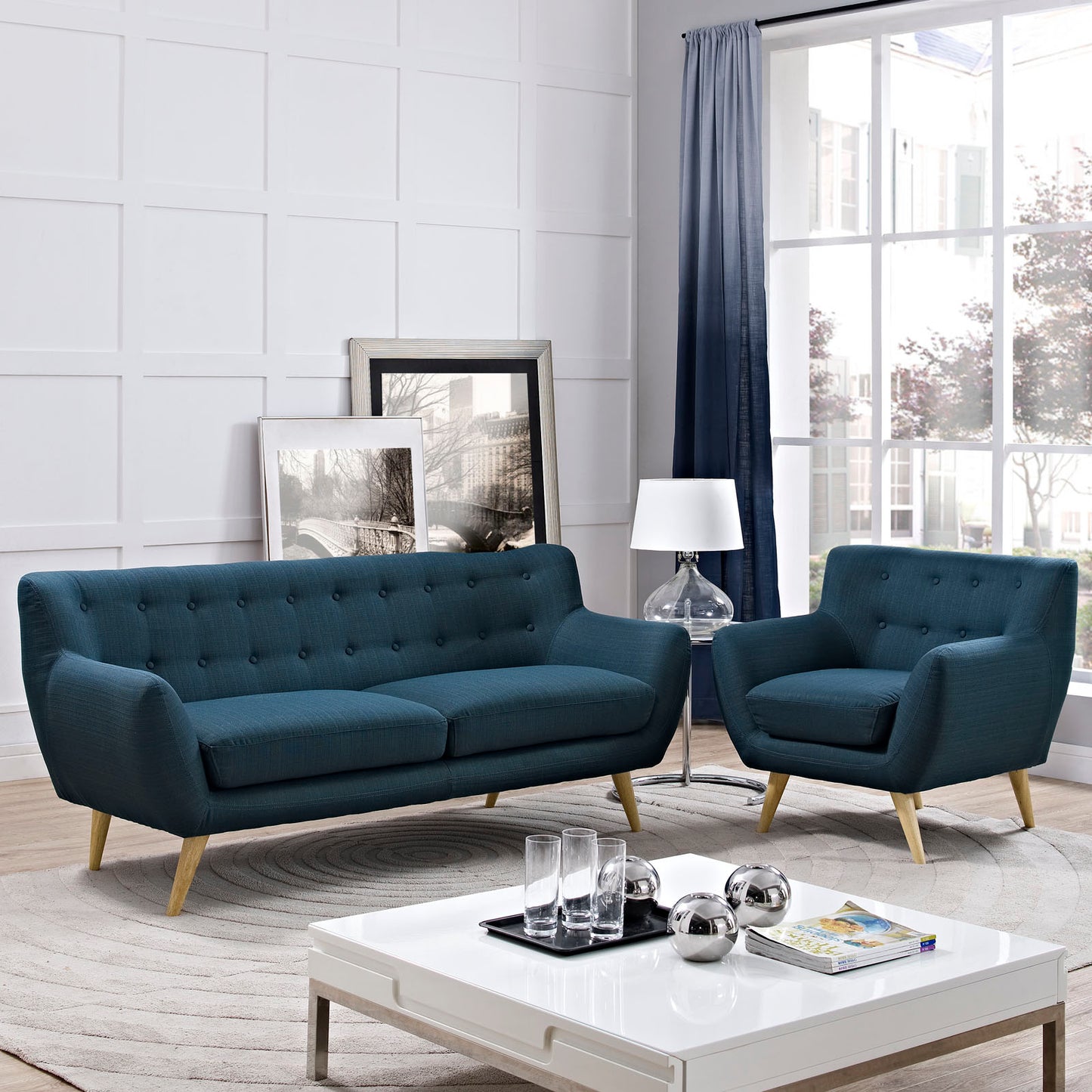 Take notice and engage your sensibilities with this plush dual cushion, organically shaped Living Room Set. Remark is gracefully positioned on solid natural wood dowel legs designed according to mid-century sentiments. Whether settling in with coffee and brunch, or entering a spirited discussion with friends, Remark’s polyester upholstery, two rows of finely stitched back seat buttons, and organic form ensure an eye-catching appeal at every turn.