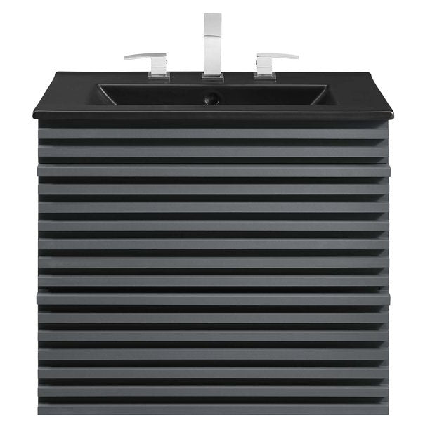 Tap into mid-century aesthetics with the Render Vanity. The Render 24" Bathroom Vanity features a durable MDF and particleboard frame with smooth walnut grain laminate, ample storage space in two full-extension drawers, and space-saving wall-mount design. Crafted with ceramic, a single sink with an integrated countertop, 8" centerset faucet holes, and rectangular sink basin continues the sleek look of this retro modern vanity.