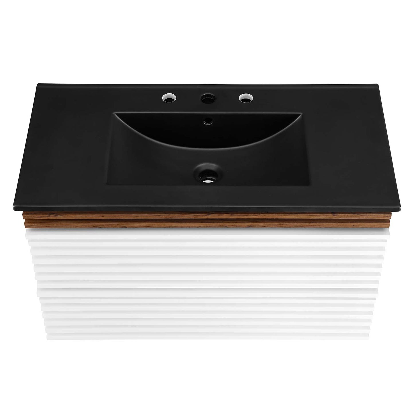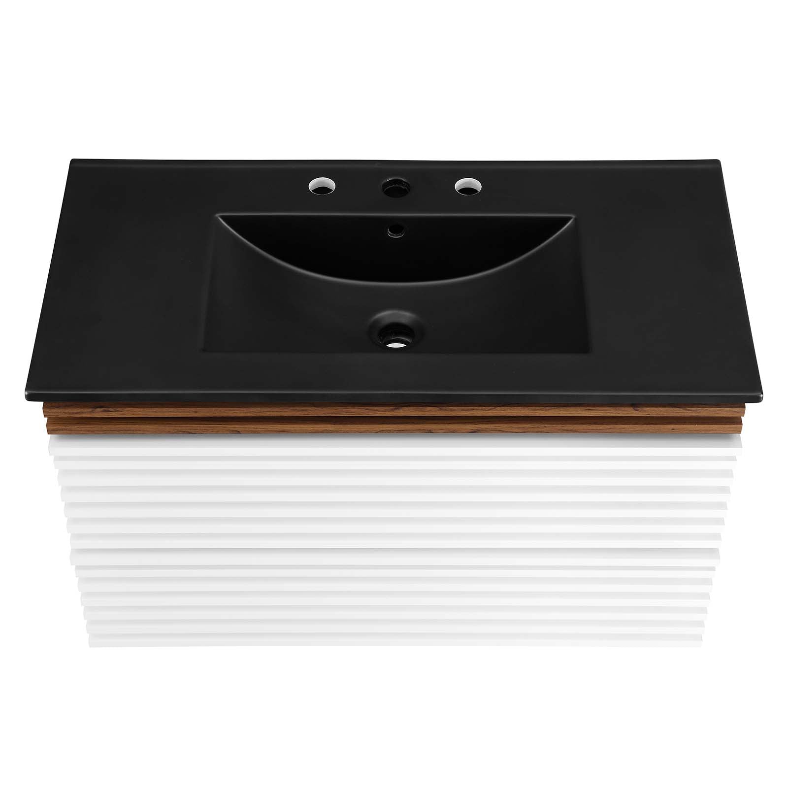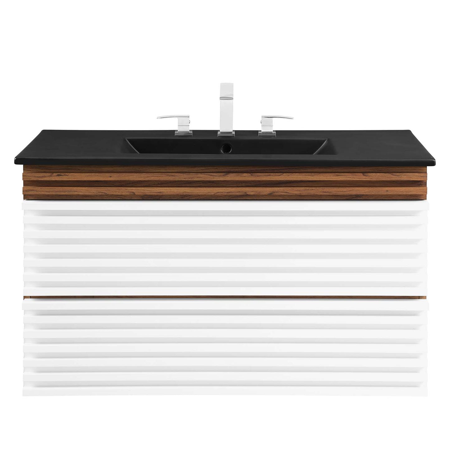 Tap into mid-century aesthetics with the Render Vanity. The Render 36" Bathroom Vanity features a durable MDF and particleboard frame with smooth walnut grain laminate, ample storage space in two full-extension drawers, and a space-saving wall-mount design. Crafted with ceramic, a single sink with an integrated countertop, 8" centerset faucet holes, and rectangular sink basin continues the sleek look of this retro modern vanity.