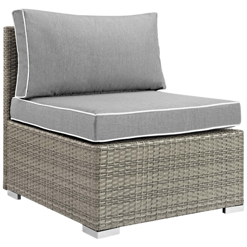 Repose Patio Armless Sectional Sofa Chair offers a detailed tan and gray synthetic rattan weave with UV protection for eye-catching appeal and durability, plush 4” thick all-weather polyester cushions with contrasting color French piping, non-marking foot pads, and a sturdy powder-coated aluminum frame that supports up to 331 pounds.