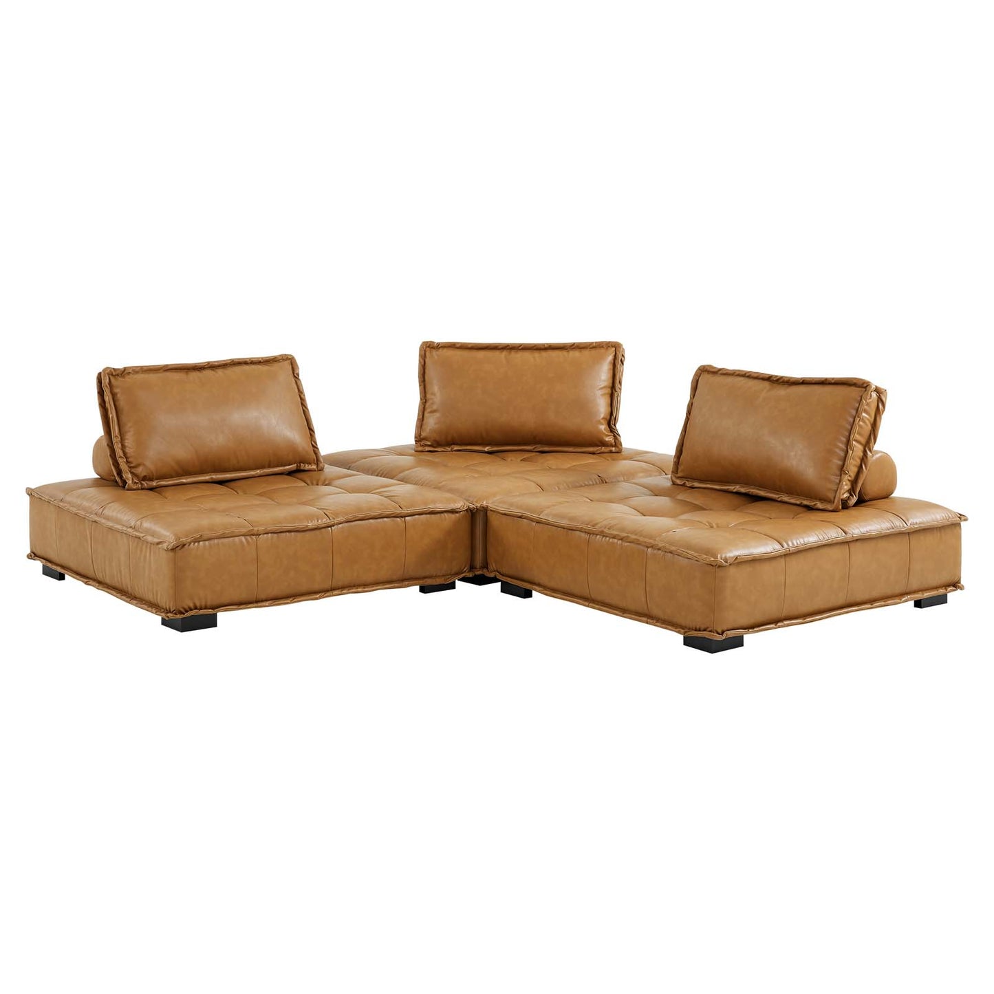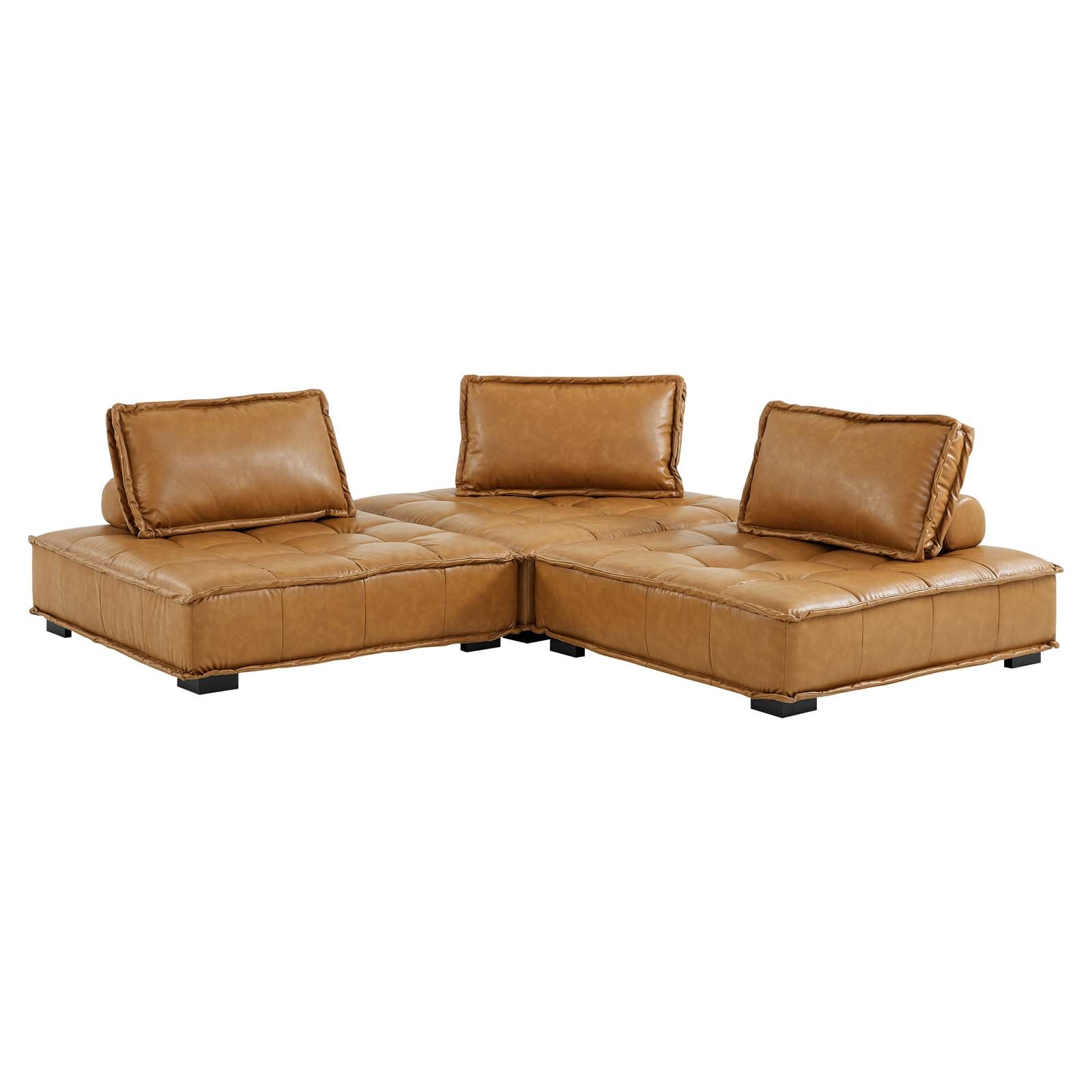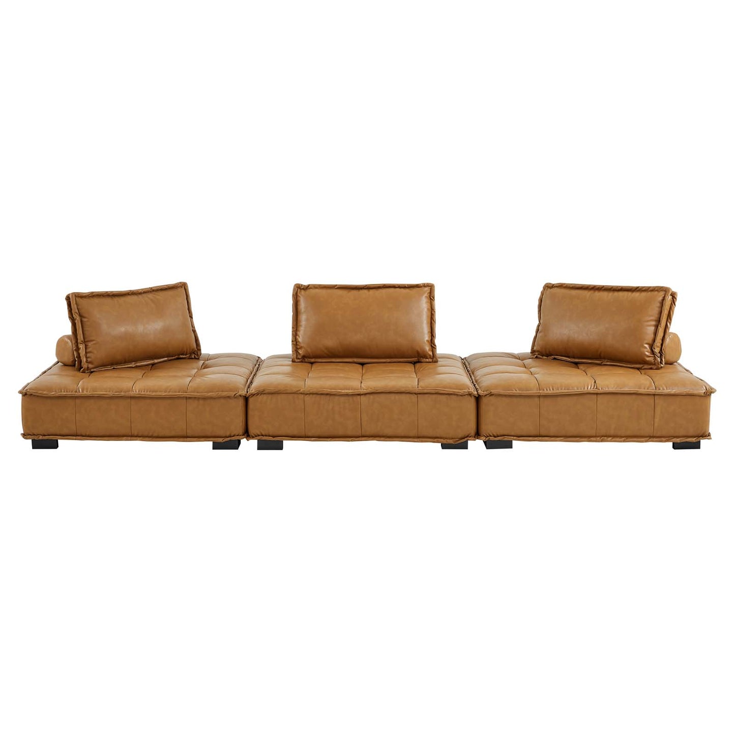 Sprawl out amidst comfort and style on the Saunter Tufted Vegan Leather 3-Piece Sofa. With square biscuit tufting, French piping detail, and vegan leather upholstery, this sectional sofa collection brings tailored style to your living space or lounge area with its charming low profile silhouette. A removable bolster pillow supporting a seat back cushion offers a comfortable place to rest while watching TV, relaxing, or entertaining. Dense foam padding and a sinuous spring support system grant a premium seating experience for all occasions. This three-piece sofa rests atop L-shaped rubberwood legs with non-marking foot caps. Set Includes: 3 Armless Chairs; Weight Capacity Each Chair: 300 lbs. Set Includes: Three - Saunter Tufted Armless Chair