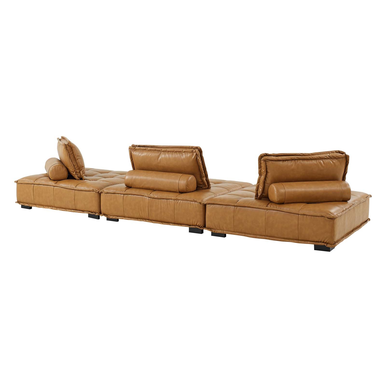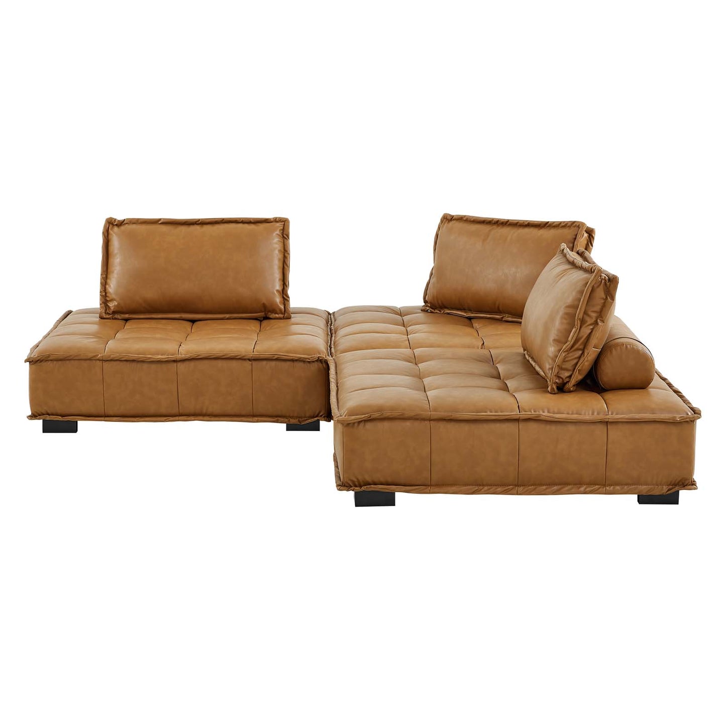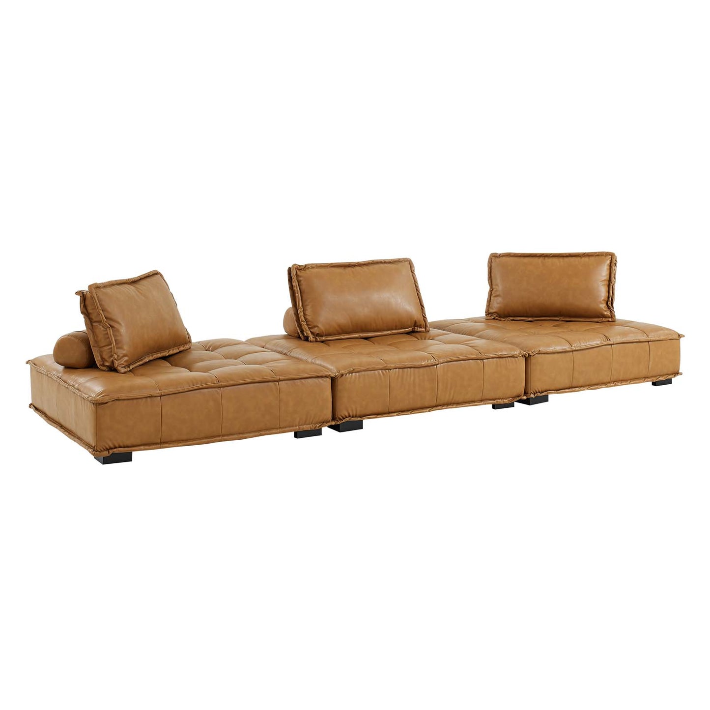 Sprawl out amidst comfort and style on the Saunter Tufted Vegan Leather 3-Piece Sofa. With square biscuit tufting, French piping detail, and vegan leather upholstery, this sectional sofa collection brings tailored style to your living space or lounge area with its charming low profile silhouette. A removable bolster pillow supporting a seat back cushion offers a comfortable place to rest while watching TV, relaxing, or entertaining. Dense foam padding and a sinuous spring support system grant a premium seating experience for all occasions. This three-piece sofa rests atop L-shaped rubberwood legs with non-marking foot caps. Set Includes: 3 Armless Chairs; Weight Capacity Each Chair: 300 lbs. Set Includes: Three - Saunter Tufted Armless Chair