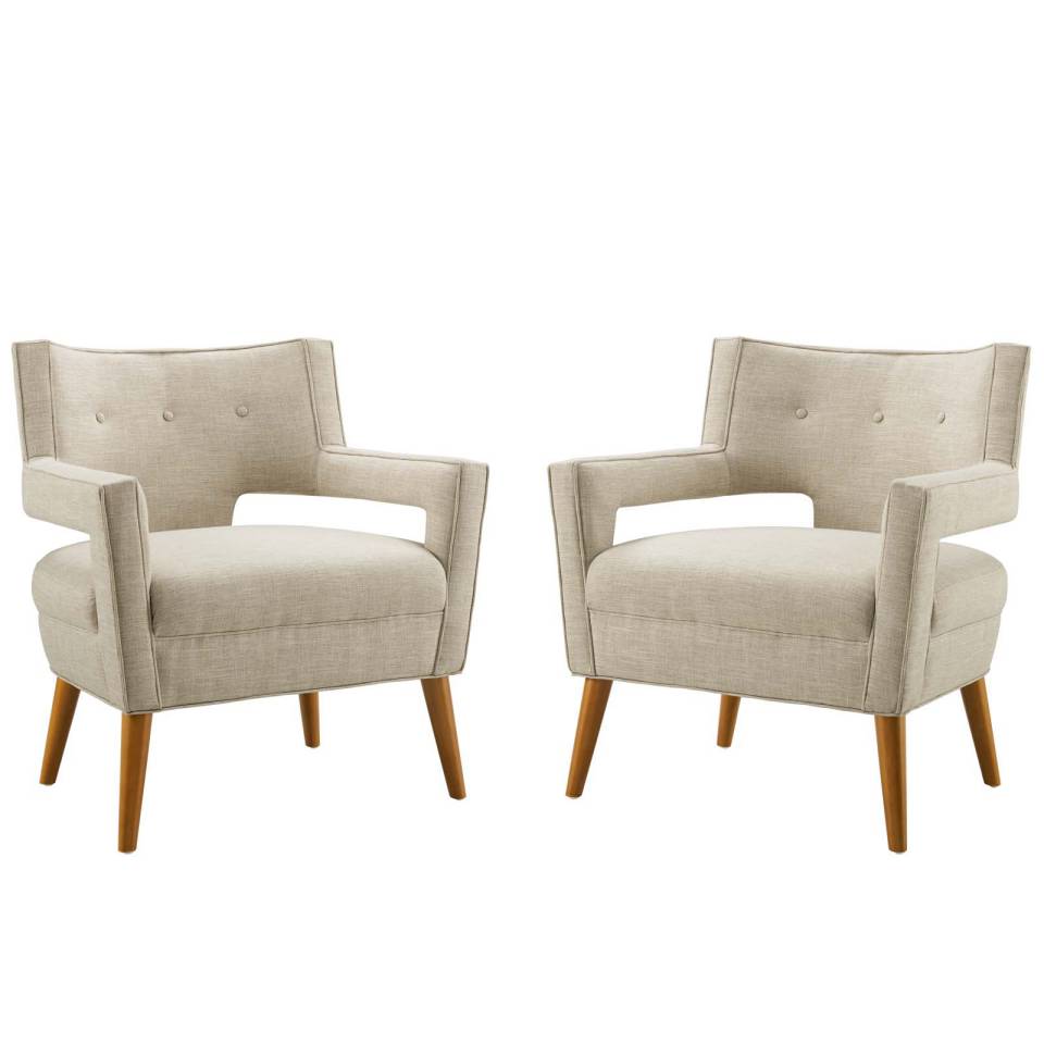 Carefully crafted simplicity and subtle sophistication blend to create the crafted simplicity of Sheer Armchair Set of 2. A mid-century modern armchair set upholstered in soft polyester fabric, Sheer features a streamlined profile and flared armrests for a striking silhouette. Complete with elegant button tufting and subtle piped trim, Sheer comes with dense foam padding positioned on a sinuous spring support system for exceptional comfort. Outfitted with tapered and splayed non-marking, cherry-stained wood legs, the Sheer Upholstered Fabric Armchair Set of 2 delivers the perfect seating area for the living room, home office, or entryway. Armchair Weight Capacity: 440 lbs. Set Includes: Two - Sheer Armchair