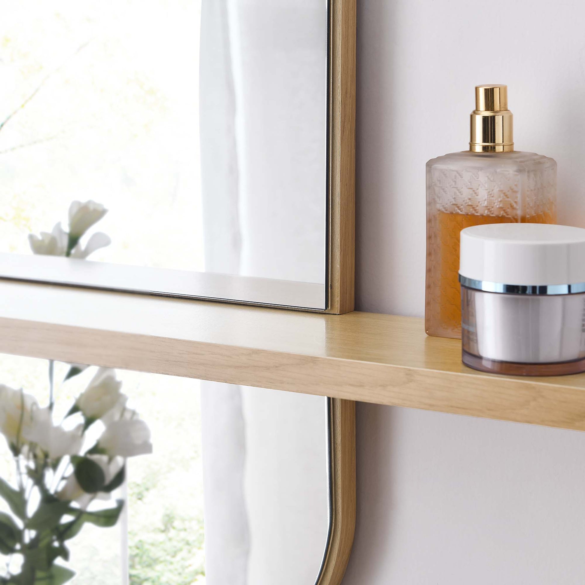 The Solstice Mirror adds an air of sophistication to any space. A good blend of contemporary and traditional styles, this rectangular mirror features rounded edges and a split design, making it the ideal decorative accent for an entryway or mudroom but also your living area, bedroom, bathroom, or vanity space. Crafted from mindi wood and particleboard with a wood grain laminate, this mirror is designed to last for years and is sure to add a touch of elegance to any interior. An added shelf is great for storing small items such as keys, personal care items, and other small accessories. With only minimal assembly required, this wall mirror is sure to be a beautiful addition to any home.
