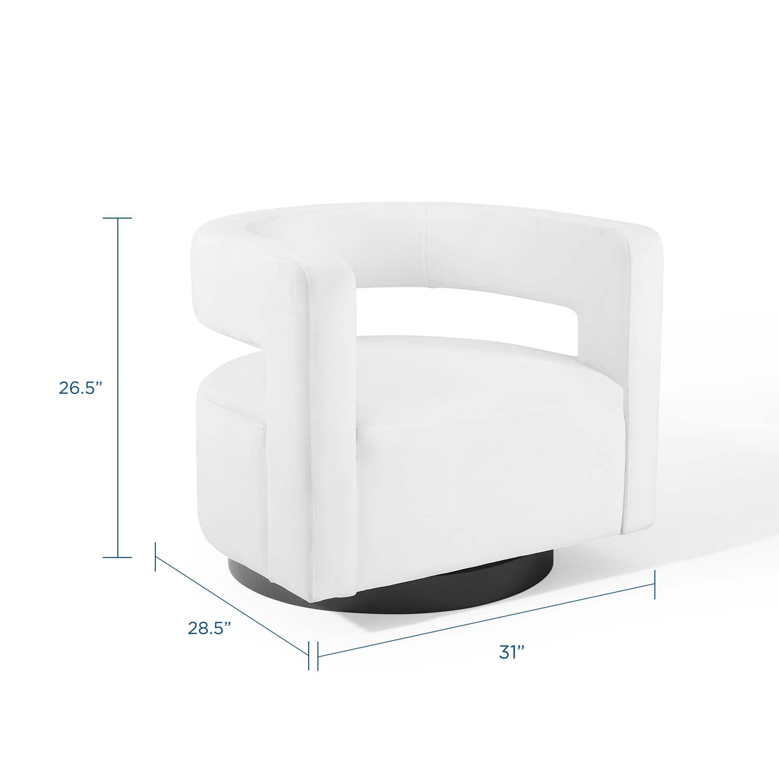 Whimsy and elegance swirl together with the Spin Performance Velvet Upholstered Swivel Accent Lounge Armchair. The glam deco design and curved cutaway back create vintage appeal for the Spin Living Room Chair, making it an accent chair that's certain to enhance a multitude of living room decor styles. Stain-resistant performance velvet polyester upholstery covers the dense foam padding creating a luxurious seat. Spin is solidly constructed from wood and plywood and sits on a 360 degree swivel textured matte black iron base. Ideally suited for your living room, lounge room, office, or other seating area, the Spin Armchair is an eye-catching addition designed to perfection. Chair Weight Capacity: 300 lbs. Set Includes: One - Spin Cutaway Swivel Armchair