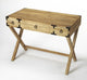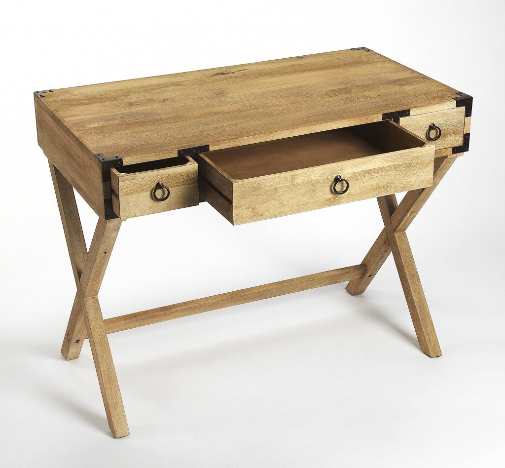 Inspire your creativity and enhance your productivity with the Natural Mango Writing Desk. Versatile in style the writing desk can also be substituted for your work from home needs. Manufactured from natural mango wood solids in a mango wood finish it is strong and durable in function. The cross legged frame is additionally supported by a wooden beam in between for better stability. The dark bronze hinged screwed edges along with the dark bronze pull rings accentuate it's presence. Owing to it's framework the desk can be easily positioned against any flat surface. 31" x 40.5" x 22"