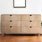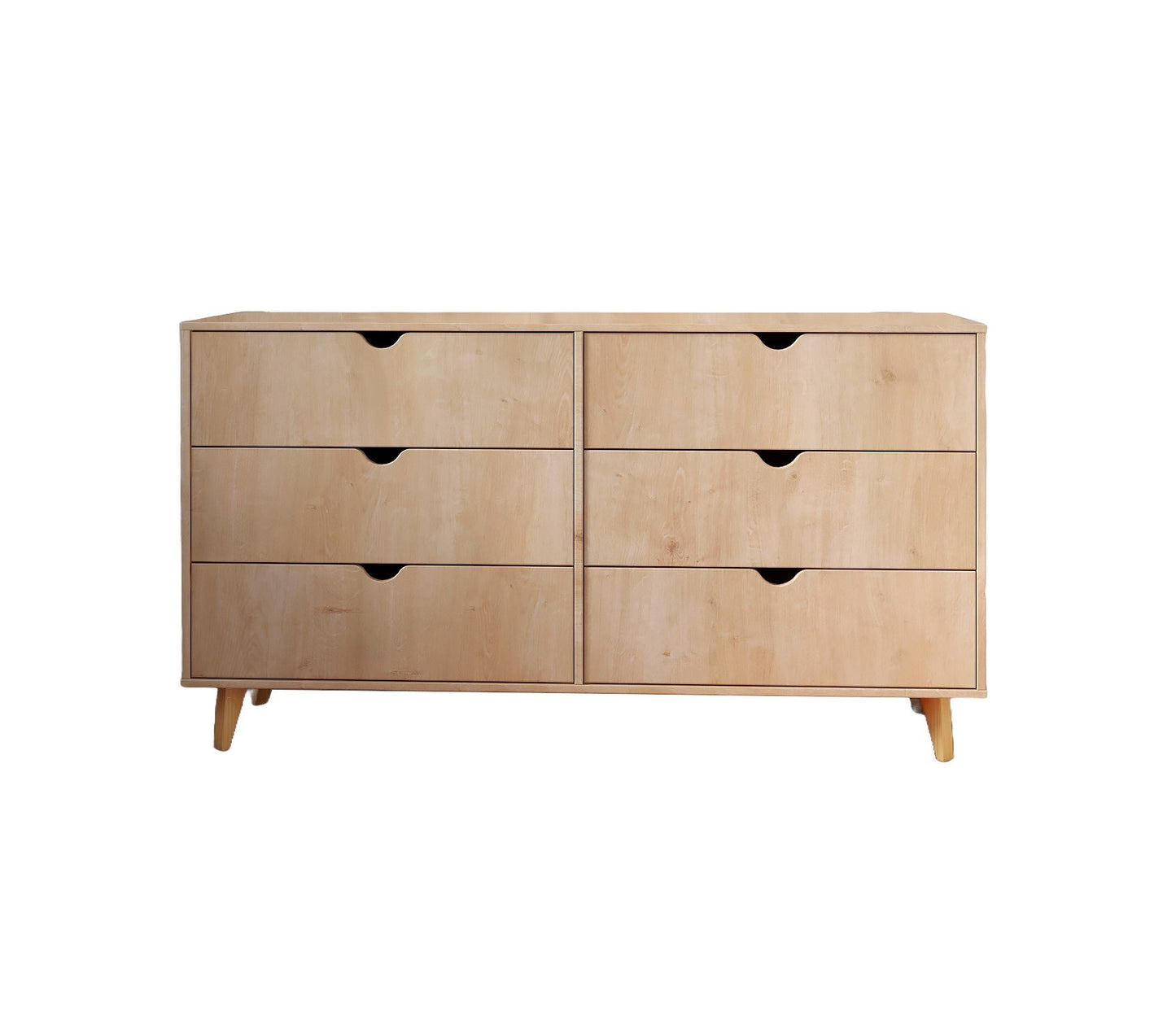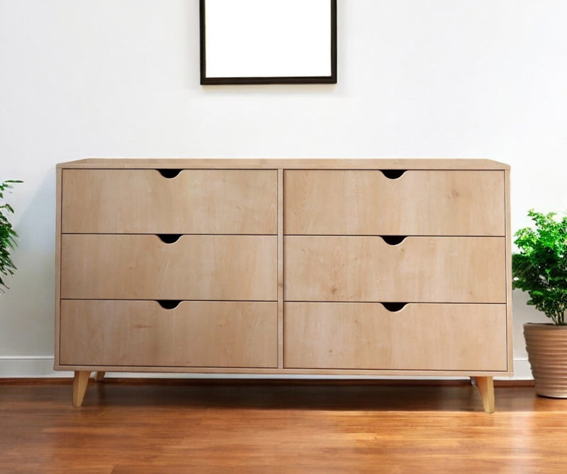 This 59-inch natural six drawer double dresser is a practical and good looking accent for your bedroom storage and organizational needs. This horizontal double dresser has column style drawers and a wide top surface area to help you with your daily dressing essentials. Loaded with capacity, this piece is equipped with six easy open drawers for practical and good looking clothing storage. Its a high quality piece, made from high grade manufactured_wood. The natural coloration of this piece is neutral and will blend easily with most any decor. 32-inch h x 59-inch w x 16-inch d.
