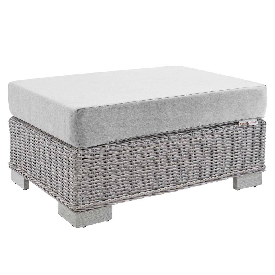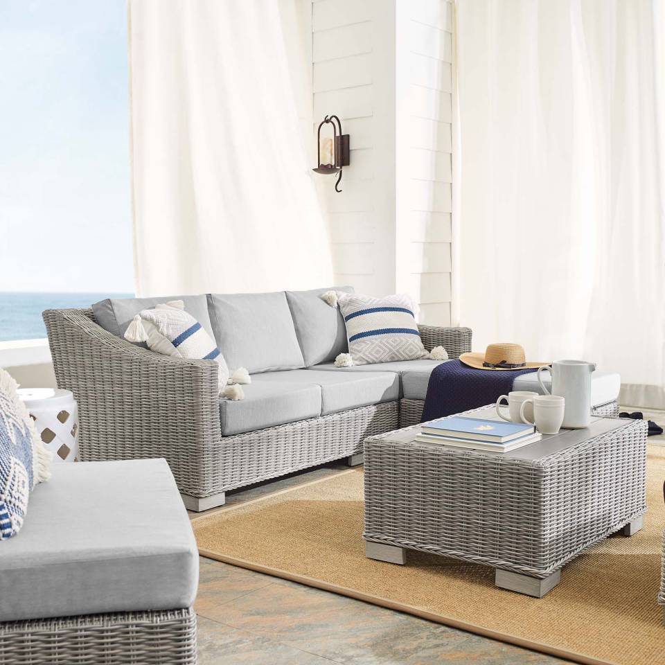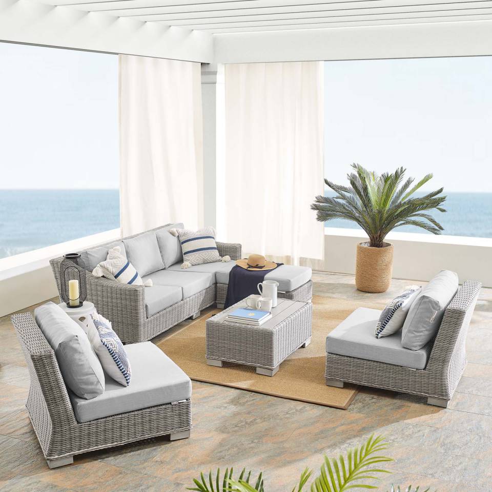 Enjoy fresh air and alfresco relaxation with the Conway Outdoor Patio Sunbrella® Wicker Rattan 5-Piece Furniture Set. Wrapped in UV-resistant light gray synthetic wicker rattan, this patio furniture set boasts organic texture and a neutral hue that brings a calming presence to your outdoor space. The frame of this outdoor furniture set and outdoor ottoman are crafted with durable powder-coated aluminum and rest on L-shaped legs with plastic foot glides. Thick foam padded cushions covered with washable water-resistant Sunbrella® covers offer a comfortable seat and affix securely to the lounge chair with cord tension attachments. Trending aesthetics and a classic design define this outdoor patio furniture collection making it a beautiful addition to any outdoor space including the backyard, patio, porch, balcony, or poolside. Assembly required. Set Includes: Sofa, Ottoman, 2 Armless Chairs, Coffee Table Set Includes: One - Conway 32" Coffee Table One - Conway Sunbrella® Ottoman One - Conway Sunbrella® Sofa Two - Conway Sunbrella® Armless Chair
