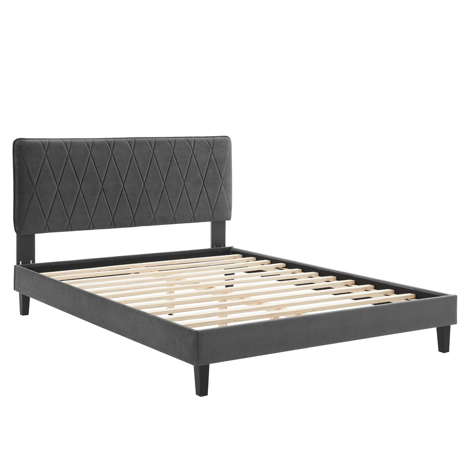 Offer glam deco style and vintage modern elegance to a teenager's bedroom or guest bedroom decor with the Phillipa Performance Velvet Full Platform Bed. The padded headboard of this full size bed features a beautiful intersecting diamond design. Rich in glam deco style and vintage modern elegance, this upholstered bed is covered in stain-resistant performance velvet and is a sturdy mattress foundation for memory foam, innerspring, latex, and hybrid mattresses. Eliminating the need for a box spring, the MDF frame of this full platform bed is complete with a wood slat support system crafted with poplar for lasting durability and support. This slatted bed frame rests on black wood legs with non-marking foot caps and includes a reinforced center beam with two support legs for enhanced stability. Assembly required. Full Bed Weight Capacity: 800 lbs. Set Includes: One - Leila Full/Queen Headboard One - Reign Full Platform Bed Frame